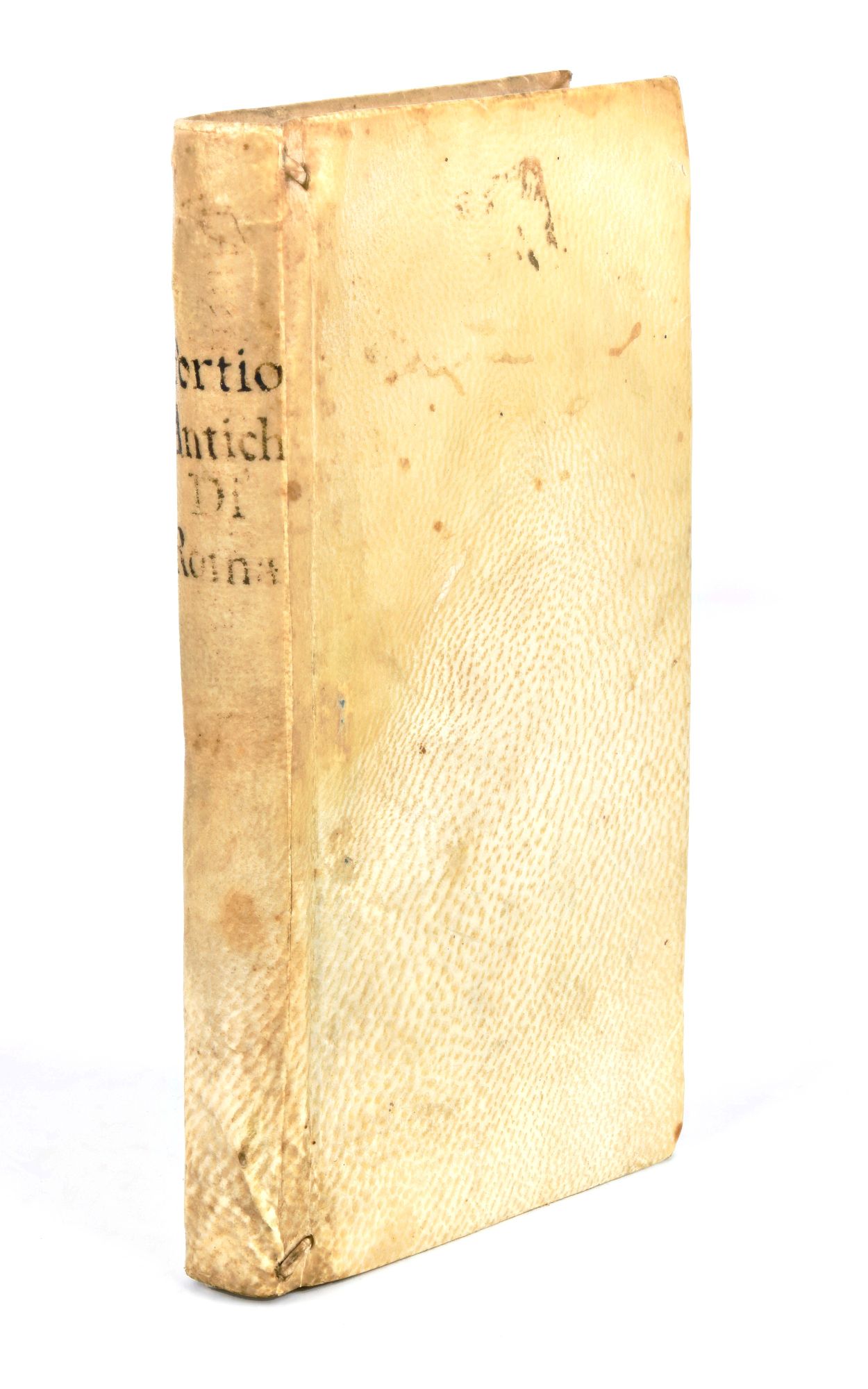 Formato in-12°, mm. 135x80, pp. (12), 176. Completo, T6, A-G12, H4. Rilegatura post. in piena pergamena antica con titoli manoscritti al dorso. Tagli delle carte in rosso. Restauro al frontespizio con carta vecchia riapplicata al verso. Gora e alone di metà pagina alle prime carte. Strappo nel testo della c. B8. Sporadiche fioriture.