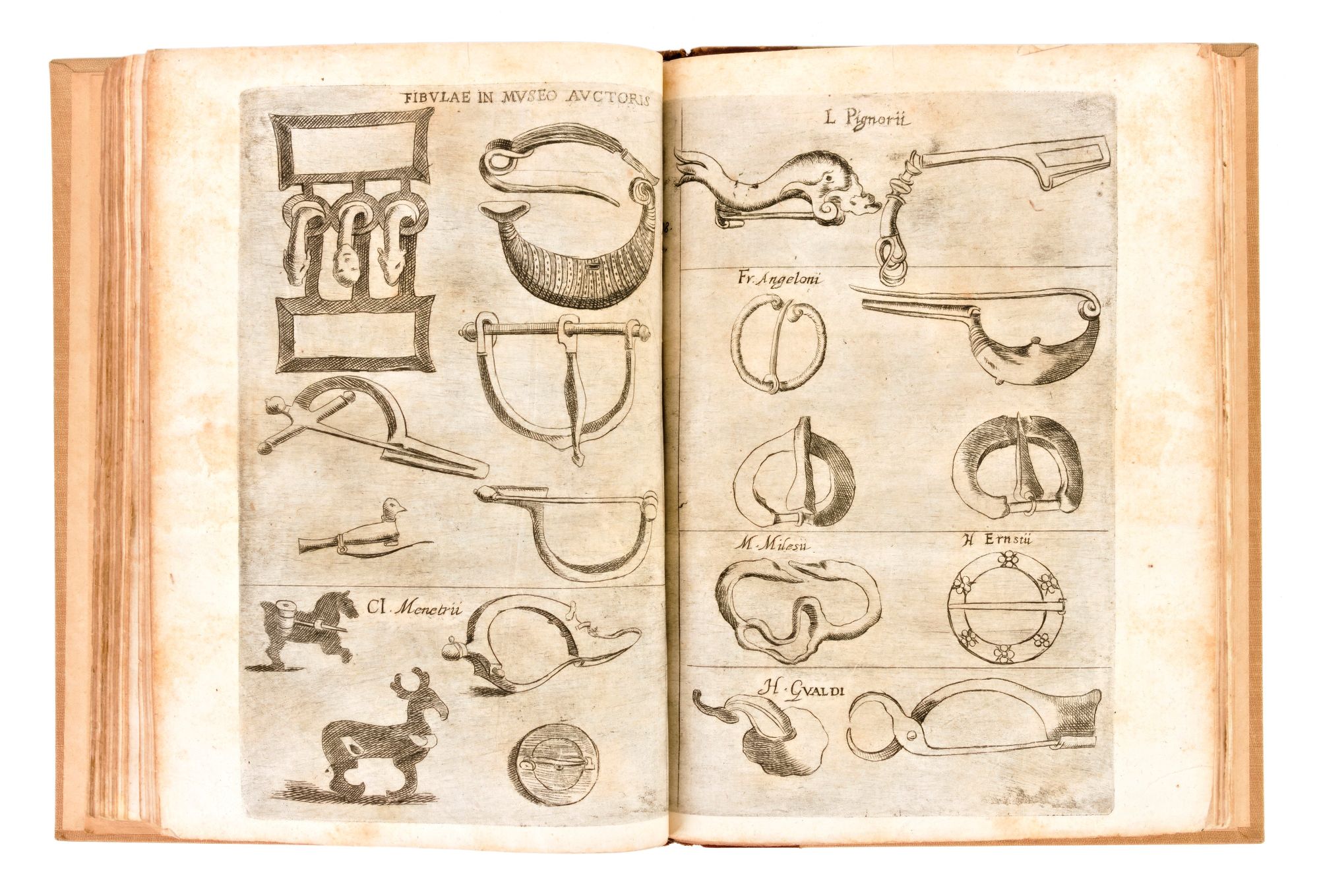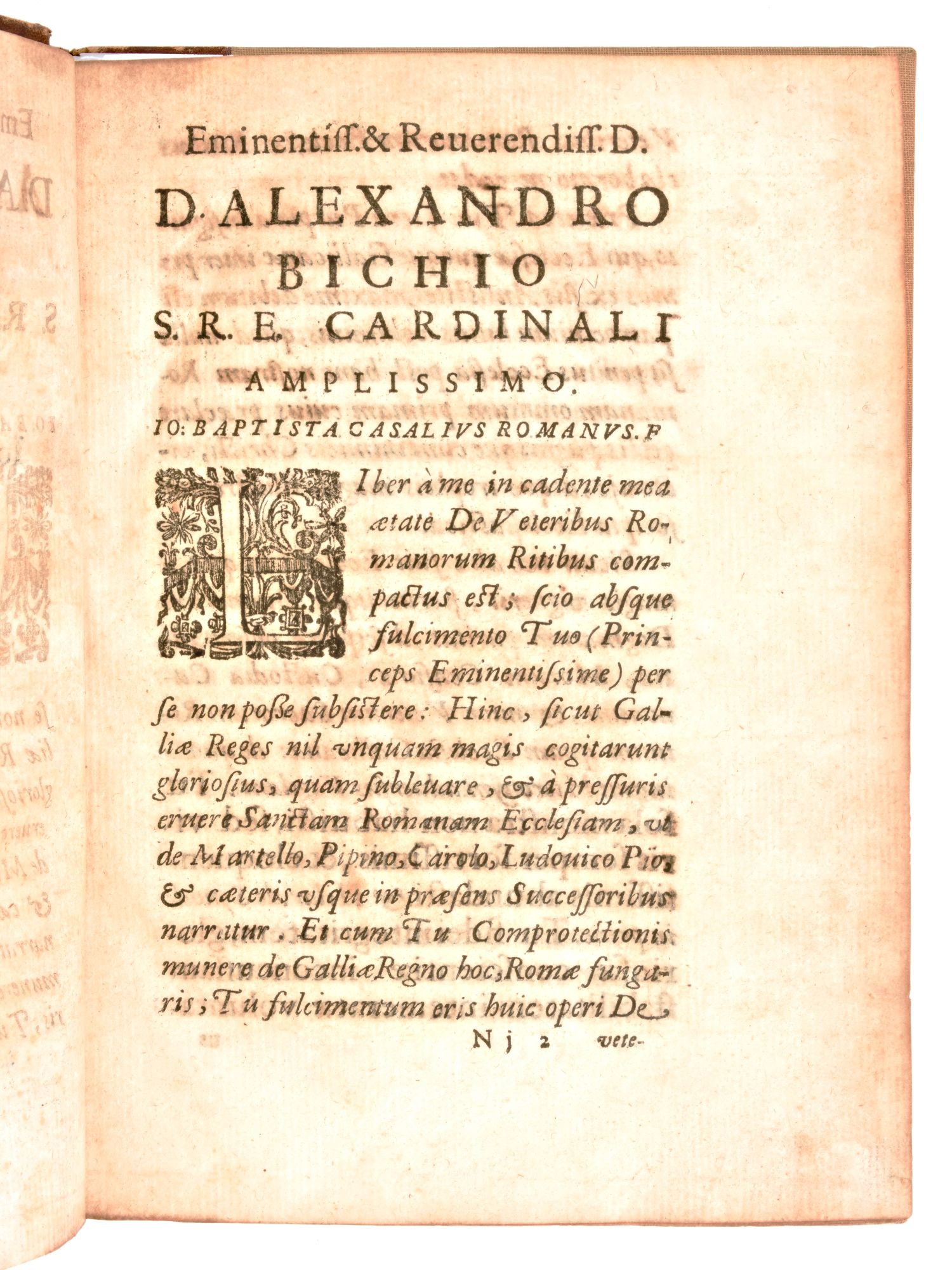 Prima edizione impressa in Roma il 1644 per Andrea Phaei, secondo volume del De profanis, et sacris veteribus ritibus (3 vol., 1644-1645), riguardante principalmente le antichità e i riti romani. Opera dell'erudita italiano Giovanni Battista Casali (1578-1648). Con 5 tavole calcografiche, 6 tavole ripiegabili e alcune figure xilografiche nel testo (medaglie, ritratti, epigrafie, attrezzi). Stemma cardinalizio calcografico del dedicatario Alessandro Bichio sul frontespizio.