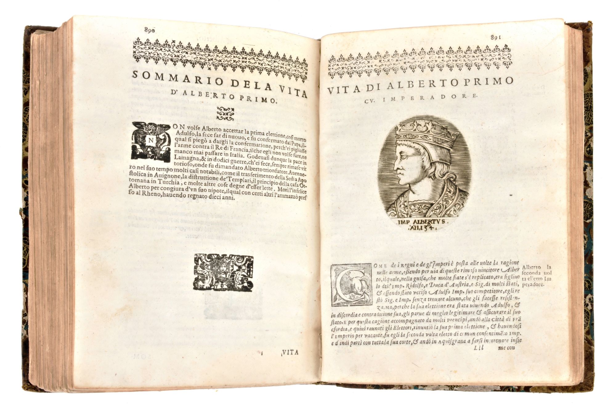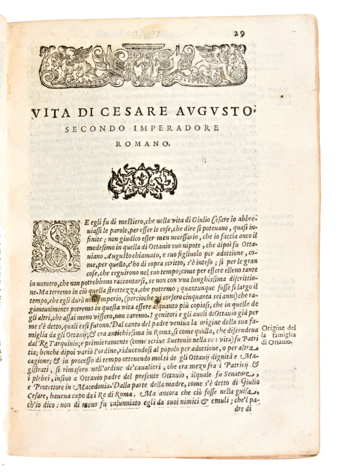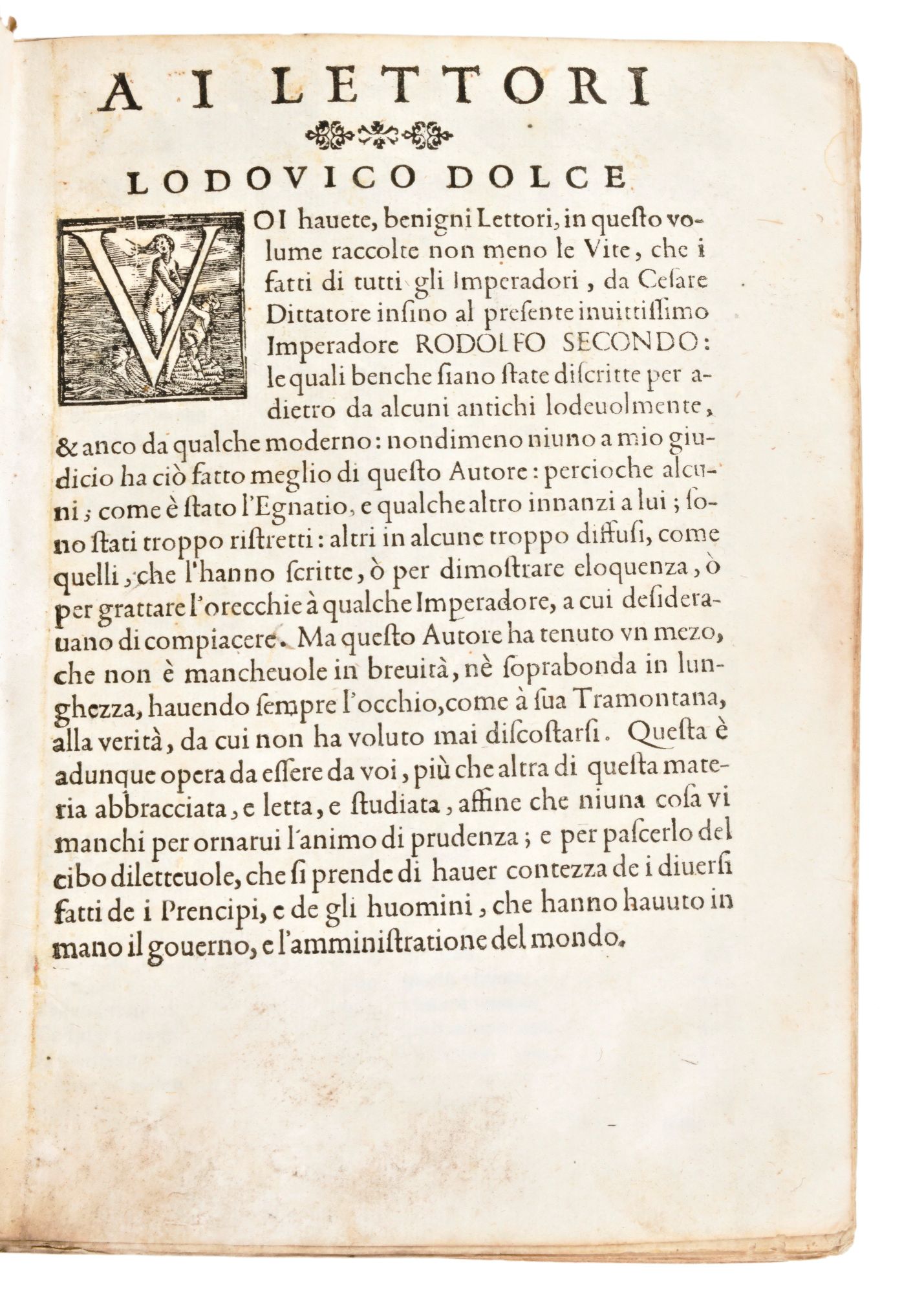 Le Vite di tutti gli imperadori romani da Giulio Cesare, sin'a Ridolfo 2. tratte per M. Lodouico Dolce dal libro spagnuolo del nobile cauagliere Pietro Messia. Aggiunteui l'effigie degl'imperadori di casa d'Austria ... Con vn sommario compendioso delle vite dei sommi pontefici romani, e l'effigie loro.. Impresso in Venezia il 1610 per Alessandro de' Vecchi. Marca tipografica in xilografia al colophon. Ritratto di Ridolfo II in calcografia al frontespizio. Numerosi ritratti incisi in calcografia nel testo. Testatine, capilettere e finalini xilografici. Presente grande testatina con vignetta in xilografia alla c. A1. Traduzione dallo spagnolo in italiano di Ludovico Dolce (c. 1508-1568), noto scrittore e grammatico italiano.