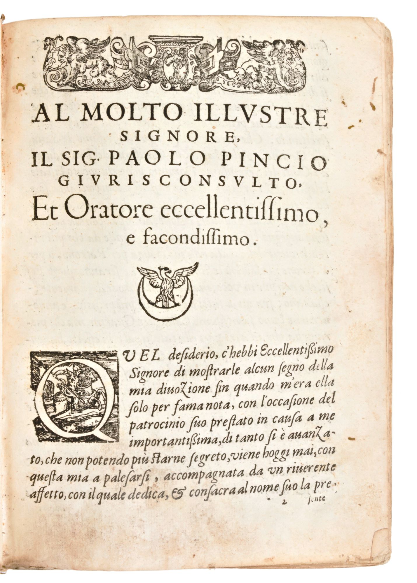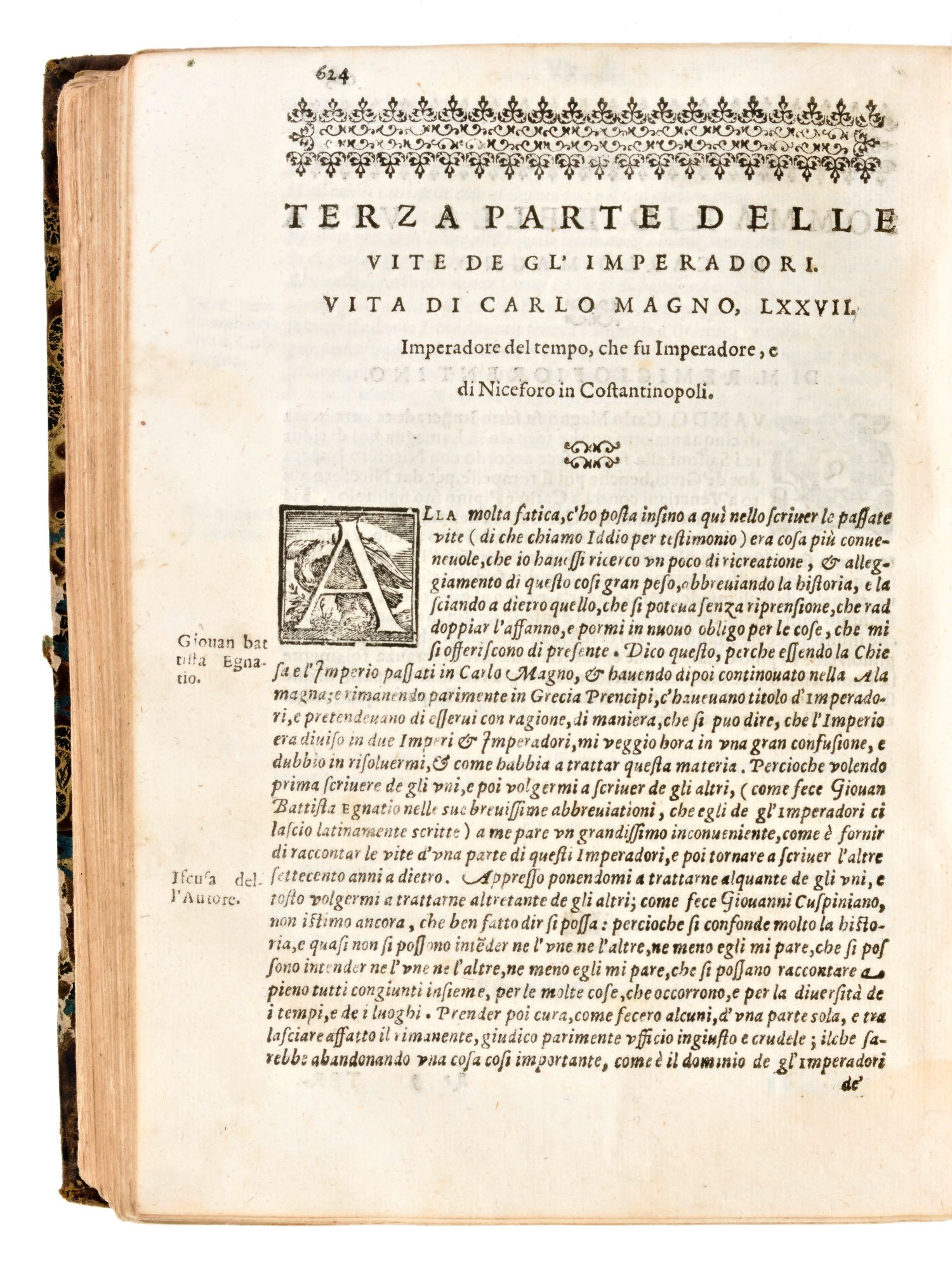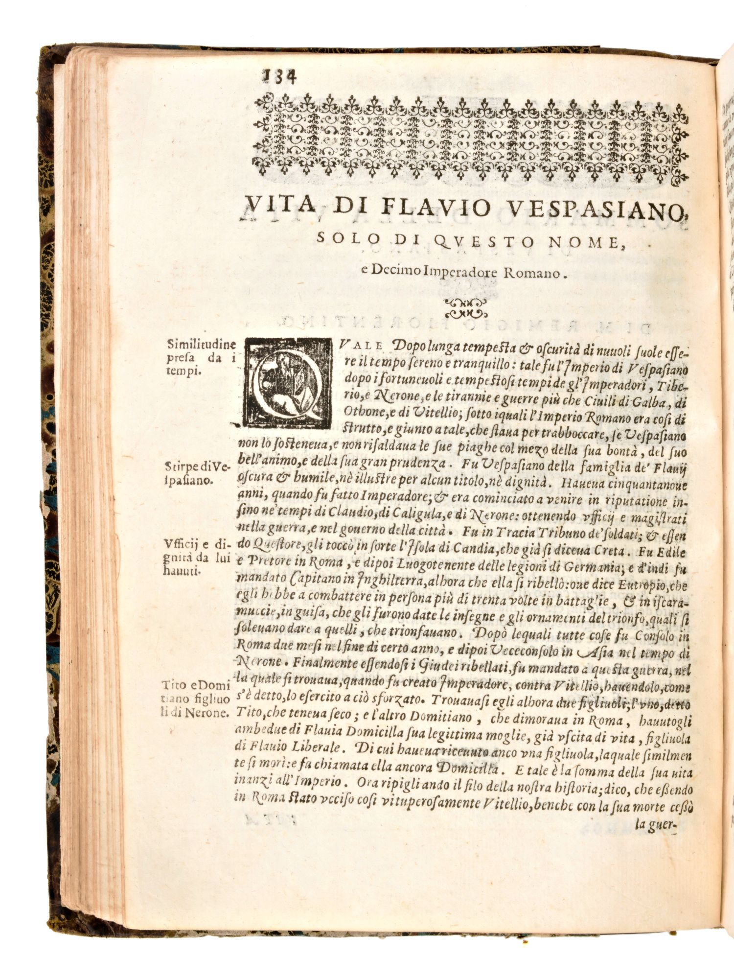 Le Vite di tutti gli imperadori romani da Giulio Cesare, sin'a Ridolfo 2. tratte per M. Lodouico Dolce dal libro spagnuolo del nobile cauagliere Pietro Messia. Aggiunteui l'effigie degl'imperadori di casa d'Austria ... Con vn sommario compendioso delle vite dei sommi pontefici romani, e l'effigie loro.. Impresso in Venezia il 1610 per Alessandro de' Vecchi. Marca tipografica in xilografia al colophon. Ritratto di Ridolfo II in calcografia al frontespizio. Numerosi ritratti incisi in calcografia nel testo. Testatine, capilettere e finalini xilografici. Presente grande testatina con vignetta in xilografia alla c. A1. Traduzione dallo spagnolo in italiano di Ludovico Dolce (c. 1508-1568), noto scrittore e grammatico italiano.