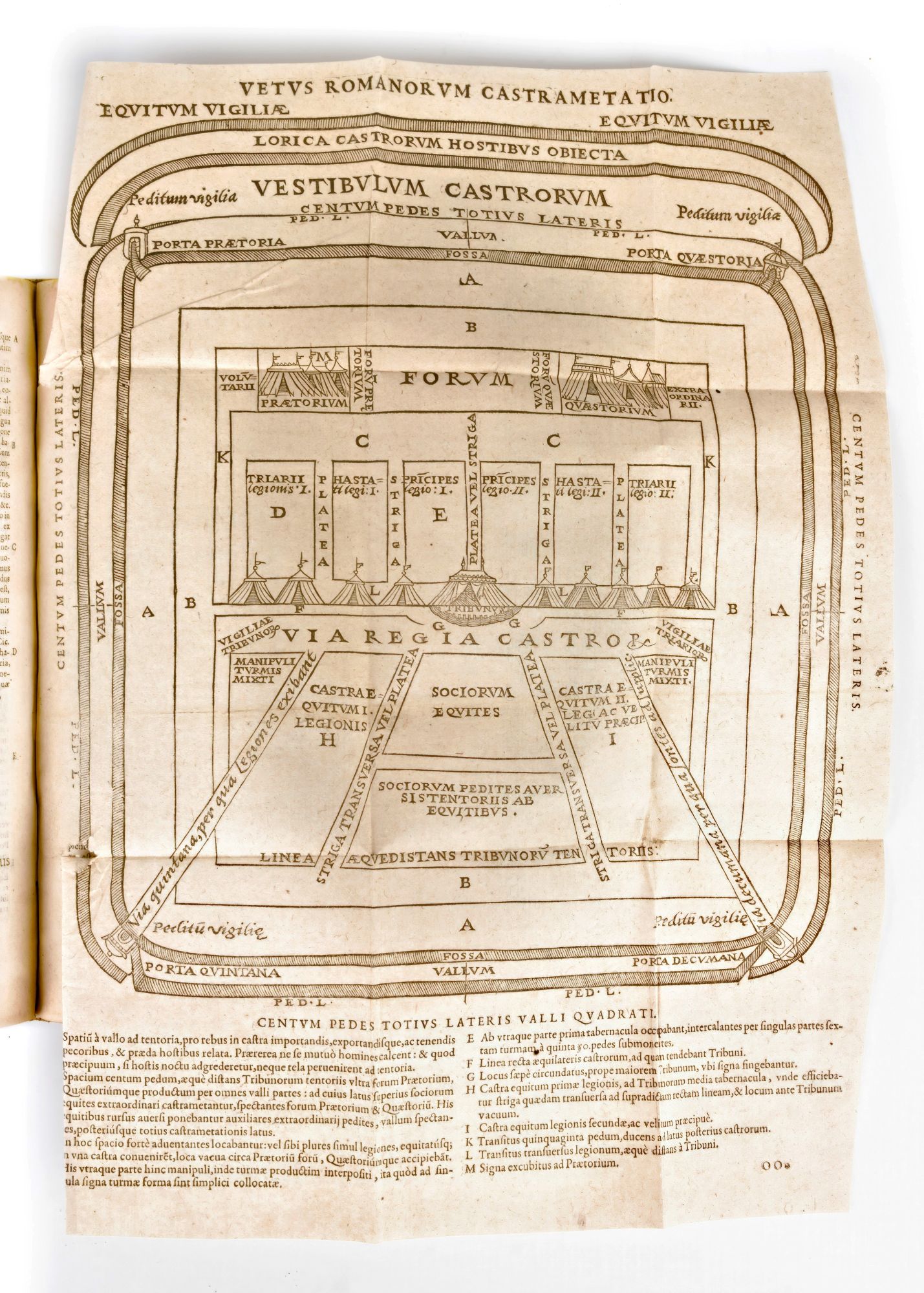 Formato in-4°, mm. 240x170, pp. (38), 663, (98), 2 cc. di tav. ripieg. / (8), 156. Completo. Rilegatura coeva in piena pergamena con titoli manoscritti al dorso, piatti con lacci in tela (rimossi). Carte rifilate con tagli blu. Ottimo esemplare, con minimi difetti e leggere fioriture alle carte. Testo latino. Marche tipografiche ai frontespizi. Testatine, capilettere e finalini xilografici. Medaglie e figure in xilografia nel testo. 2 tavole ripiegabili (Mappa di Roma & vestibolo via Regia castro) alla prima opera.
