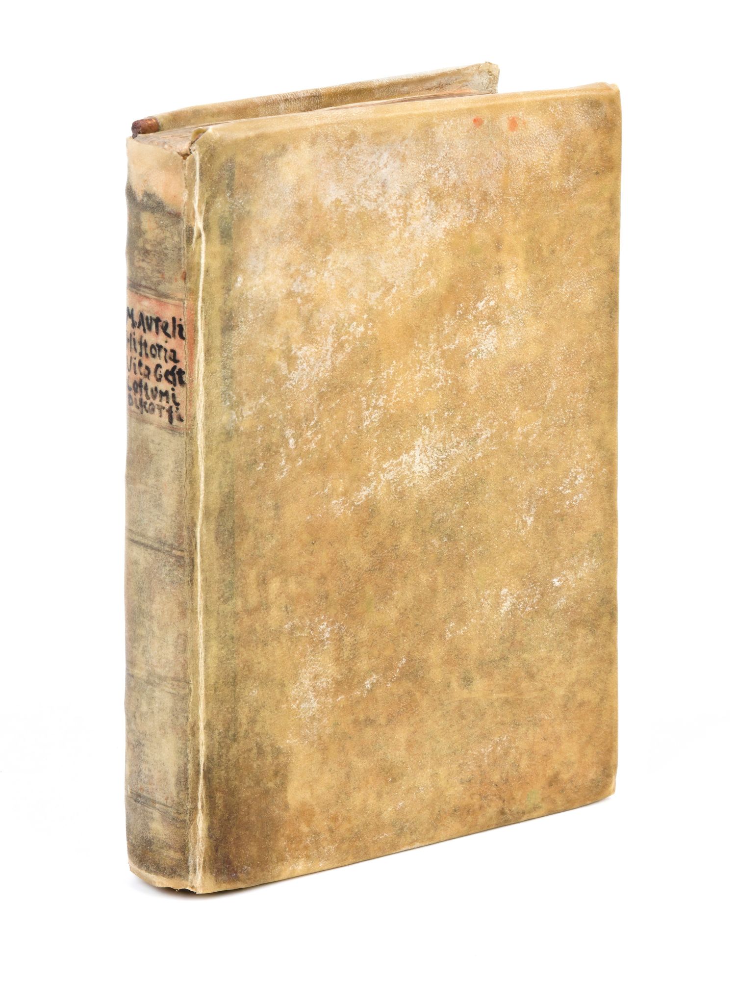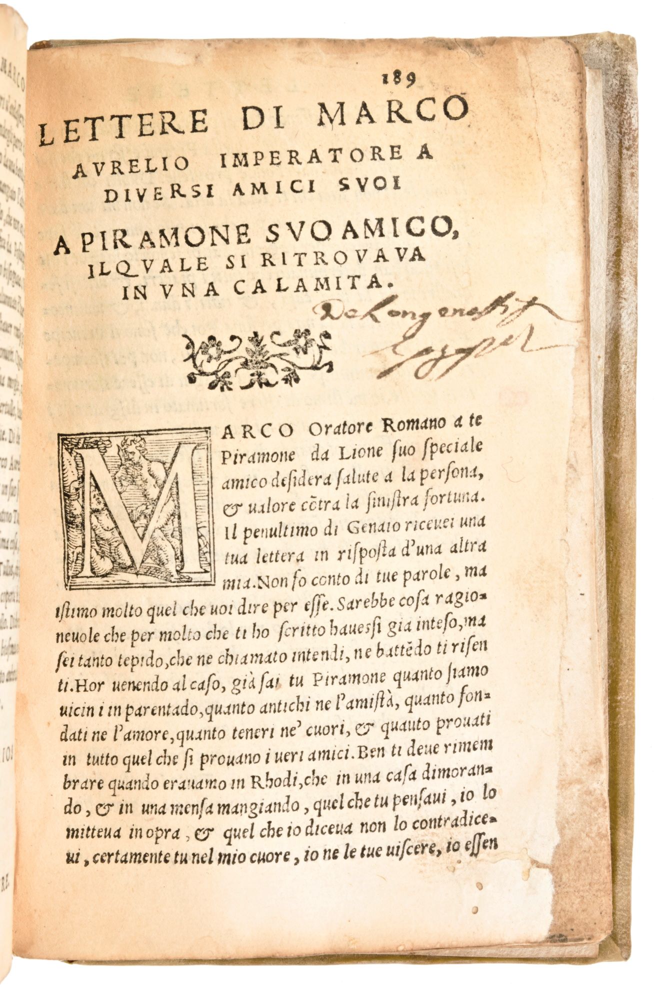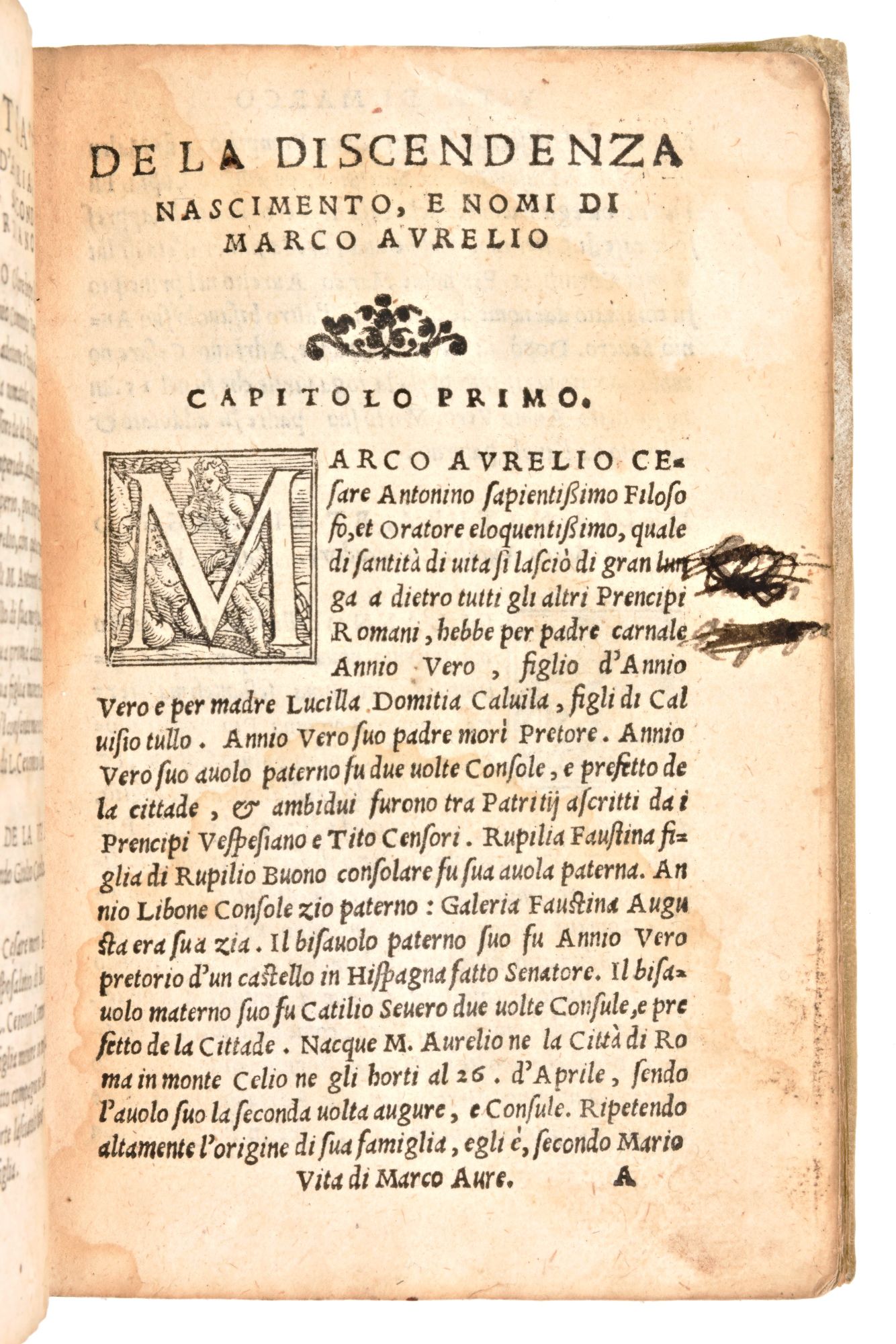 Vita gesti costumi, discorsi, et lettere di Marco Aurelio imperatore ... Con la giunta di moltissime cose che, nello spagnuolo non erano, et delle cose spaguole, che mancano, nella traduttione, italiana. In Venezia il 1555 (la prima 1528) per Alessandro Viani. Marca tipografica in xilografia al frontespizio. Vita ed epistolari dell'imperatore romano Marco Aurelio (121 d.C. - 180 d.c.), dello scrittore spagnolo Antonio de Guevara (1480-1544). Testo italiano. Capilettera xilografici.