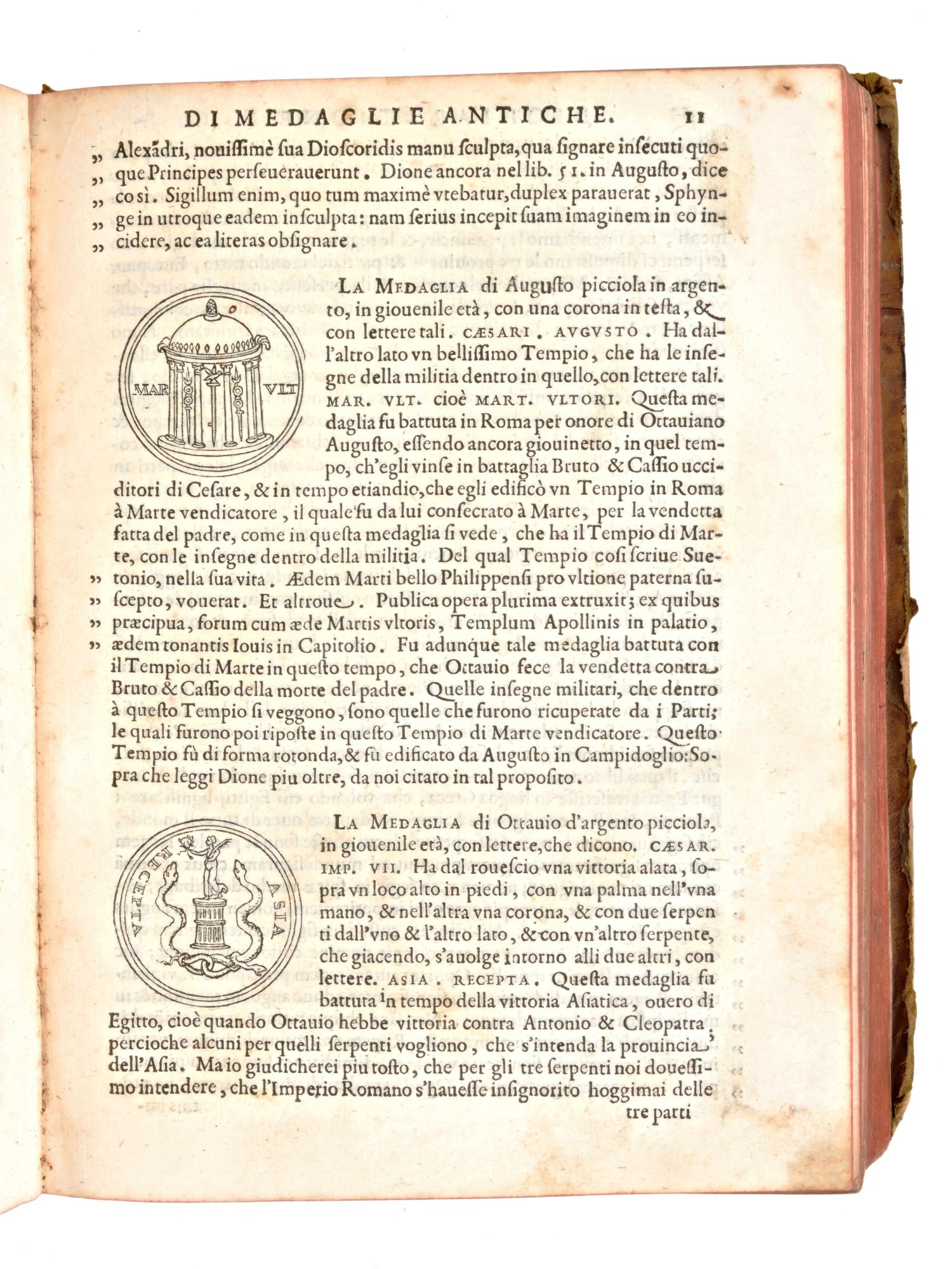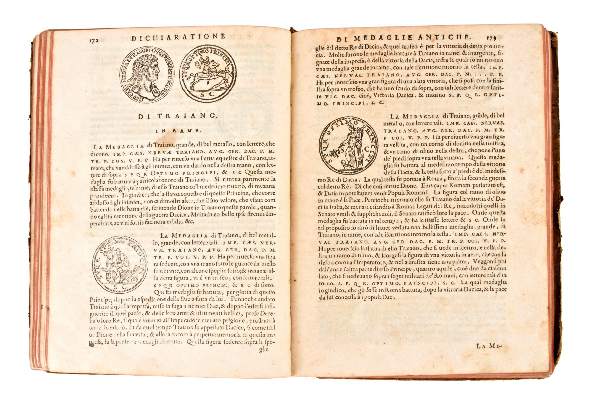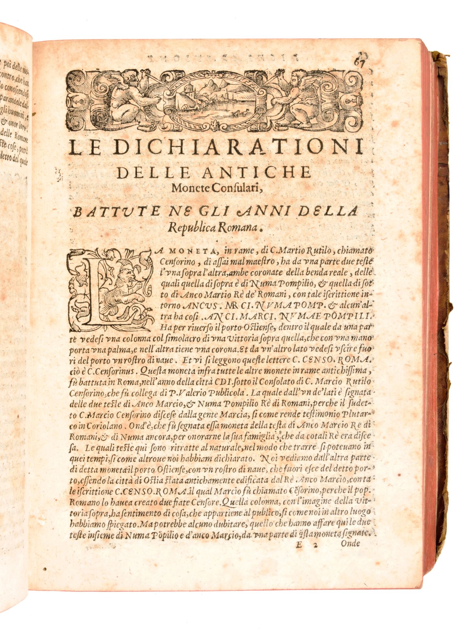 Formato in-8°, mm. 205x155, pp. (16), 282, (2), 572. Completo. Rilegatura coeva in piena pelle con titoli manoscritti al dorso post. Tagli delle carte in rosso. Difetti e spellature ai piatti e al dorso, piatto anteriore parzialmente distaccato. Piccoli lavori di tarlo marginali, con minimi difetti. Testo nitido, sporadiche fioriture. Frontespizio in xilografia. Capilettera, finalini xilografici. Numerose figure incise nel testo raffiguranti medaglie e monete.