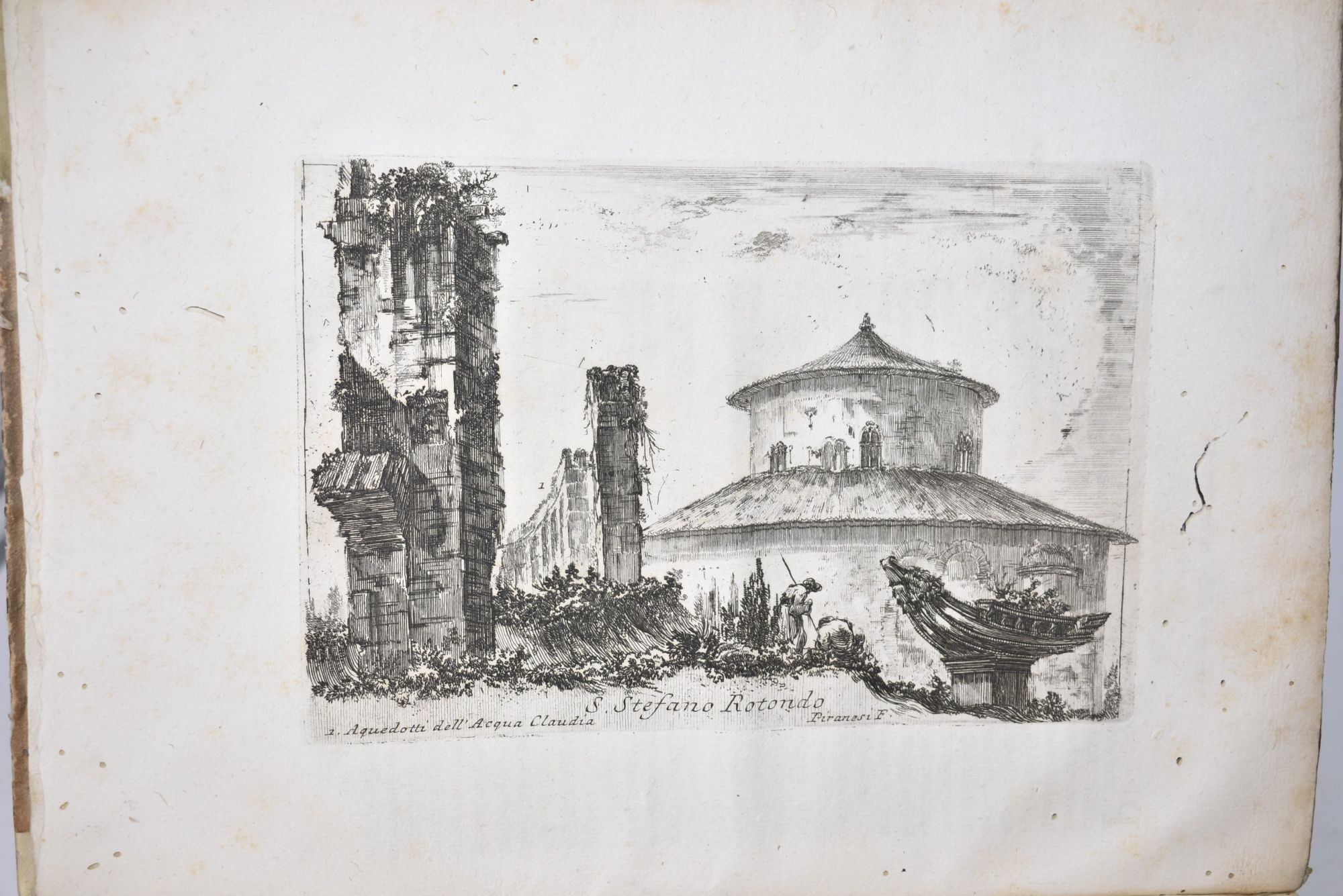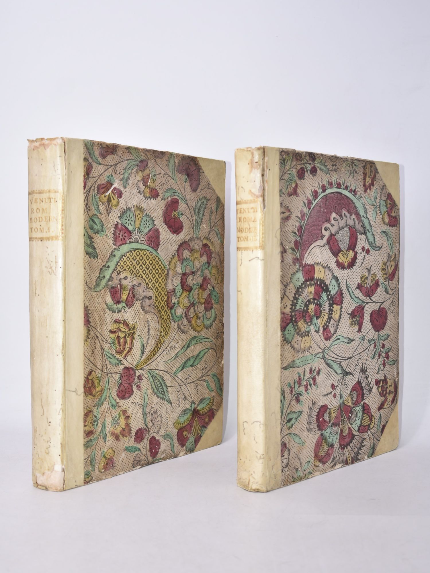 Una delle principali e più esaustive opere sulla topografia di Roma antica, raro esemplare dalla tiratura completa delle 54 tavole di apparato iconografico, con monumenti e vedute di Roma finemente incise su disegni realizzati anche da Giovanni Battista PIRANESI (1720-1778). Include la tavola raffigurante Villa Borghese. Esemplare marginoso, con legature genuine in mezza pergamena e piatti rivestiti in pregevole carta decorata a fiori e colorata a mano; ex libris araldico di William Charles de Meuron Earl Fitzwilliam ai contropiatti; ambedue i volumi presentano piccoli fori di tarlo per lo più marginali, con lievi perdite di testo limitatamente alle prime carte.