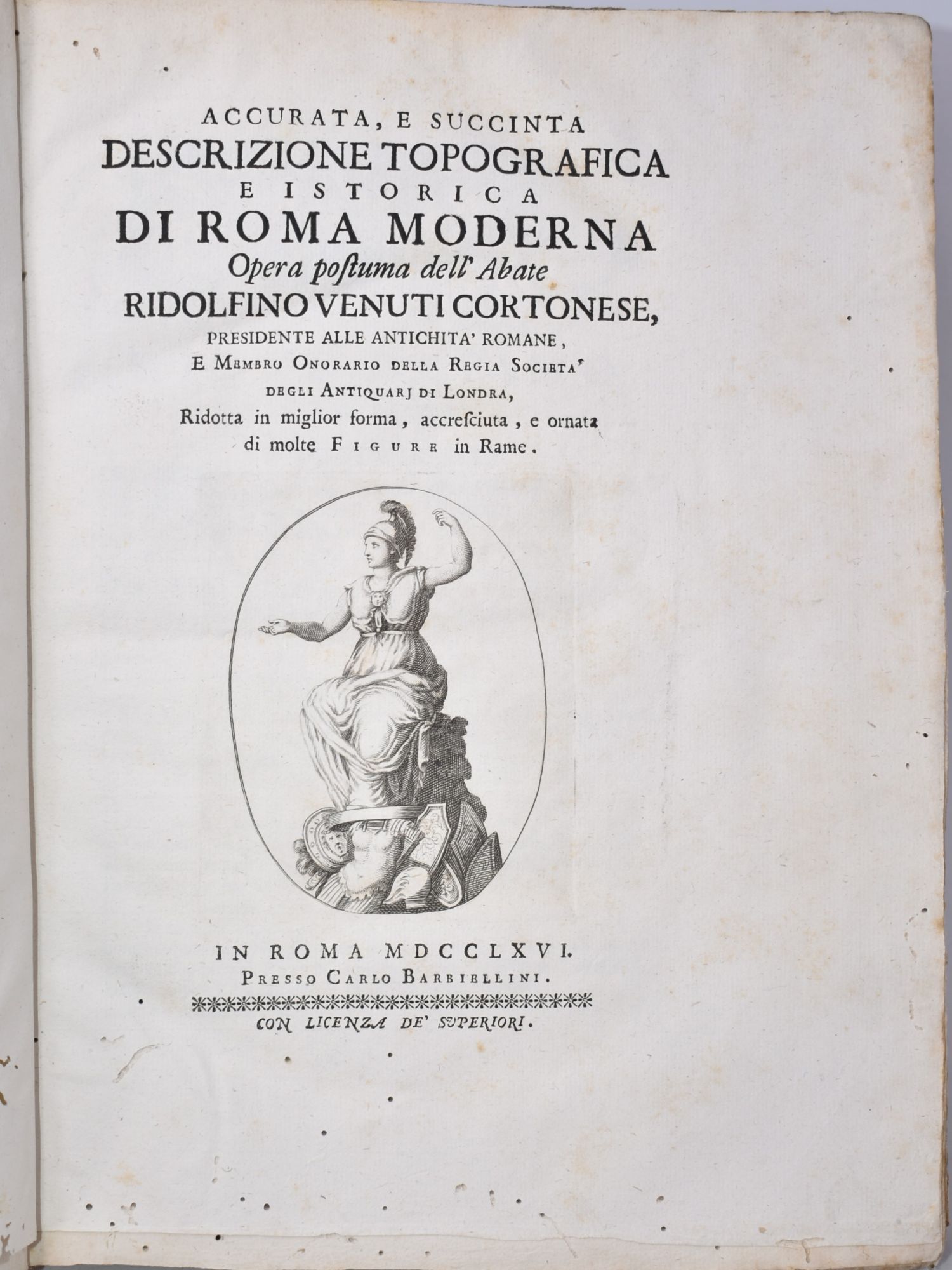Venuti, Ridolfino ACCURATA, E SUCCINTA DESCRIZIONE TOPOGRAFICA E ISTORICA DI ROMA MODERNA. OPERA POSTUMA DELL'ABATE RIDOLFINO VENUTI CORTONESE, ... RIDOTTA IN MIGLIOR FORMA , ACCRESCIUTA , E ORNATA DI MOLTE FIGURE IN RAME. In Roma, 1766, presso Carlo Barbiellini.