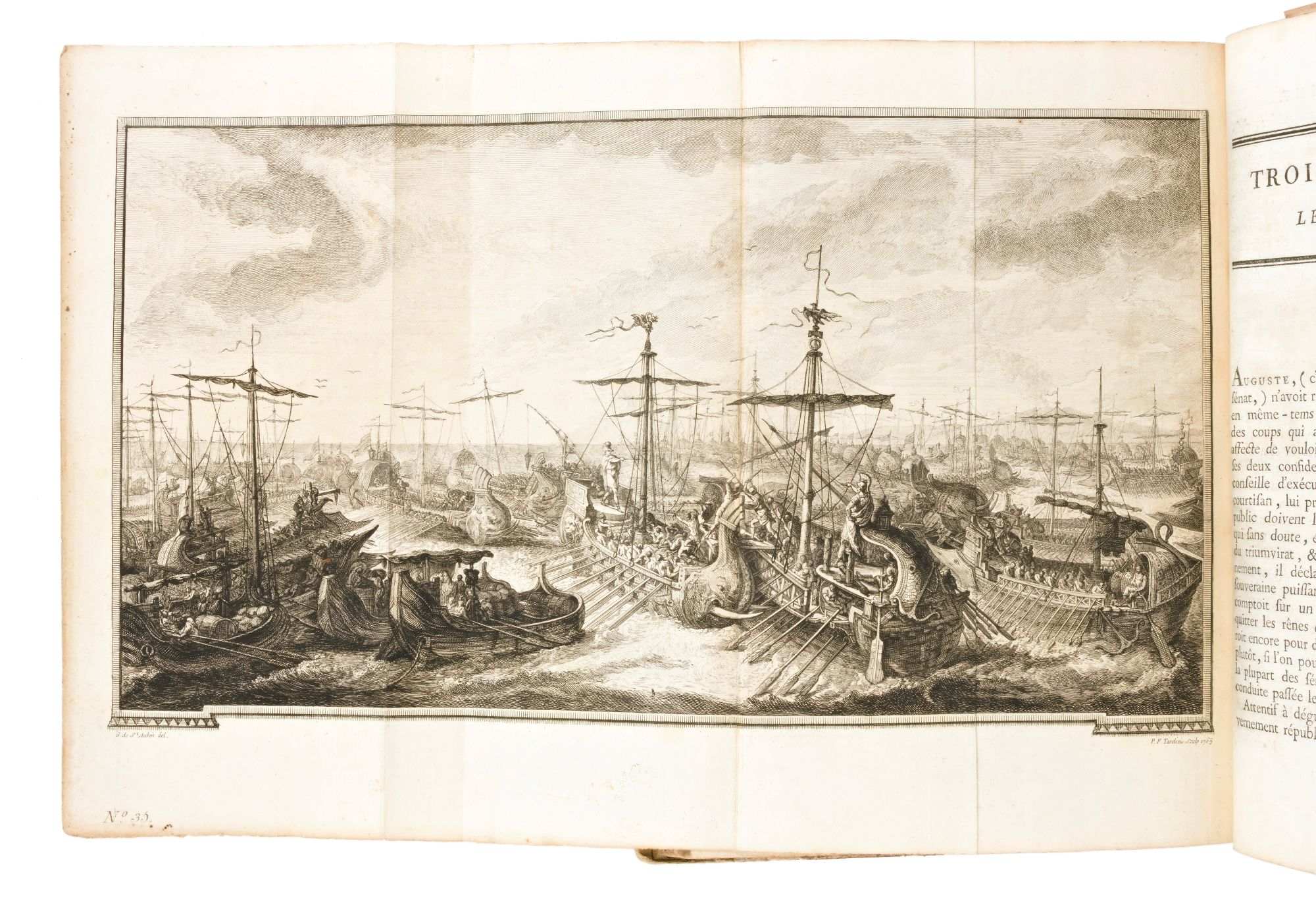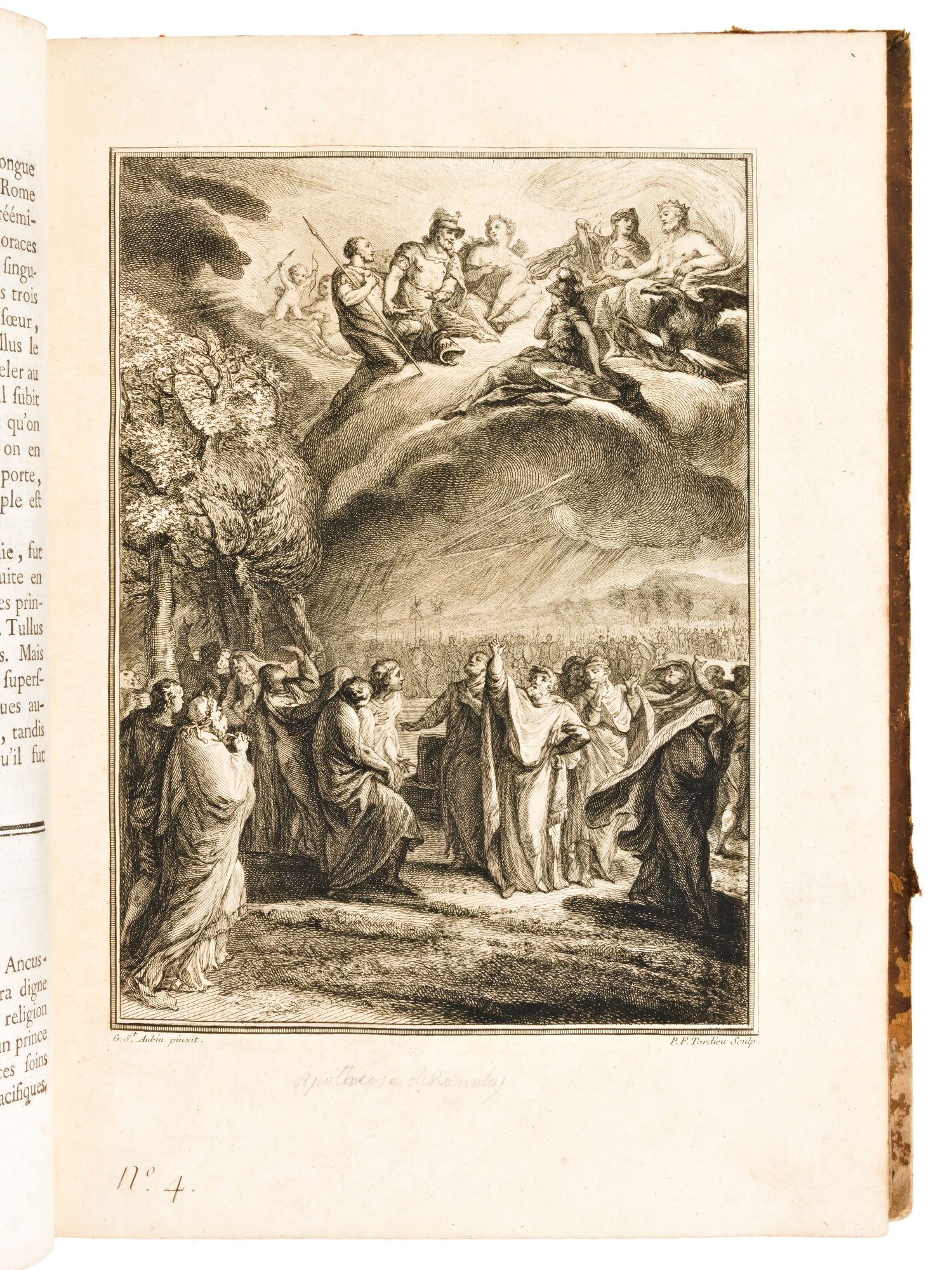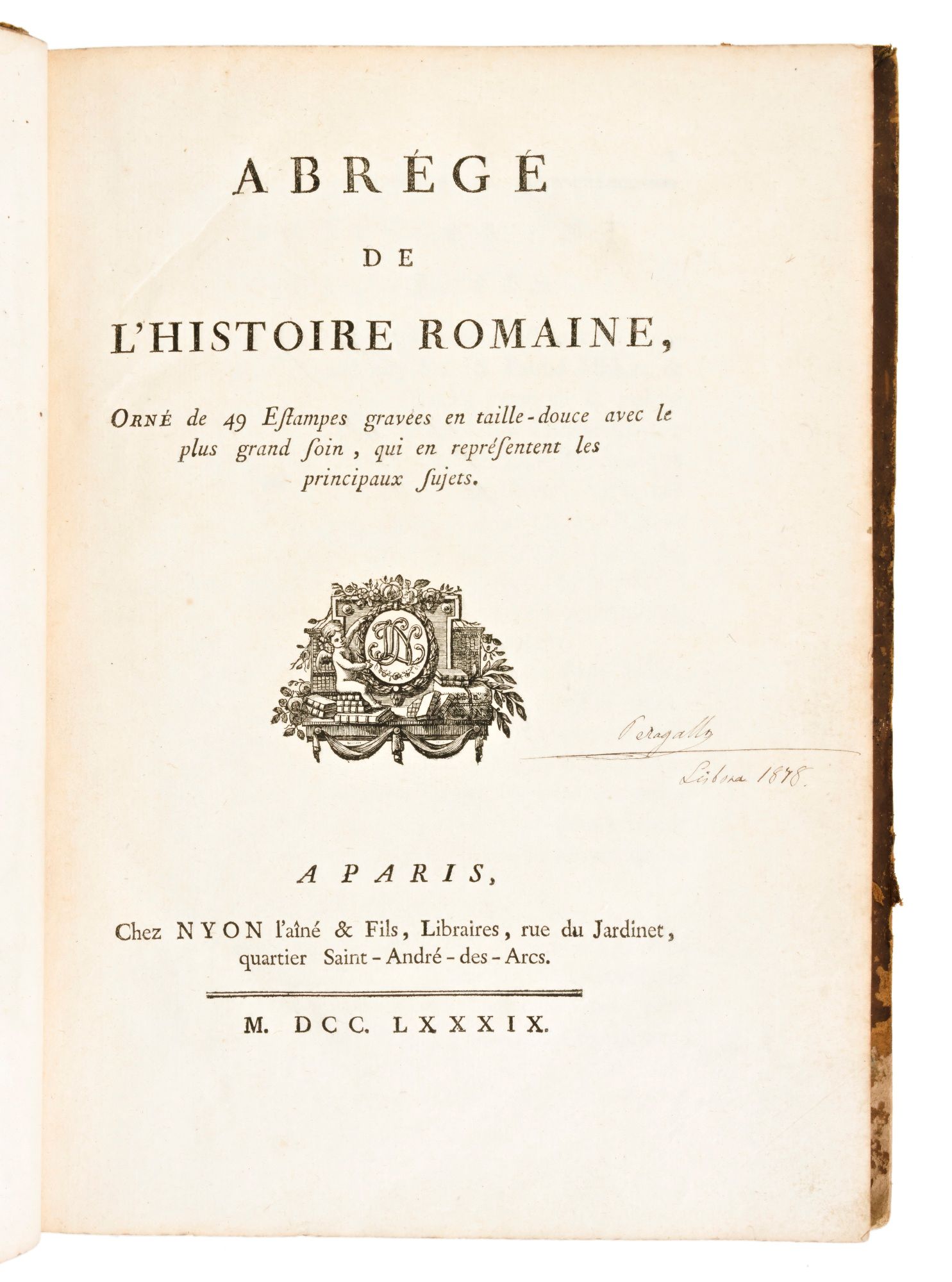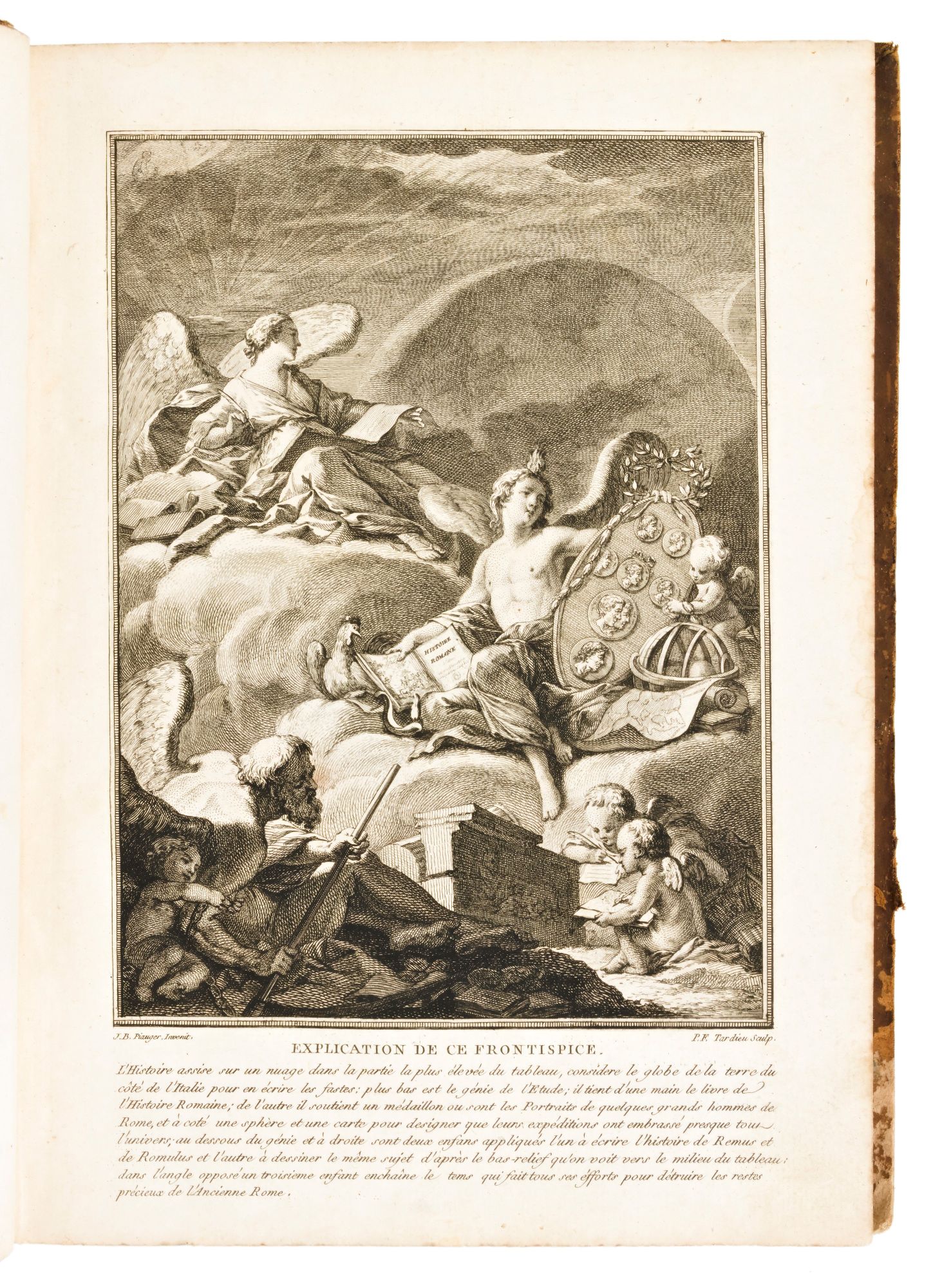 Antiporta calcografica dell'incisore Nicolas-Henri Tardieu (1674-1749), su disegno di Jean Baptiste Piauger (XVIII sec.). Edizione impressa in Parigi per Jean Luc Nyon il 1789. Con 48 tavole calcografiche fuori testo raffiguranti principalmente gli avvenimenti e i luoghi più memorabili dell'antica Roma. Testo francese. Capilettera e finalini xilografici.