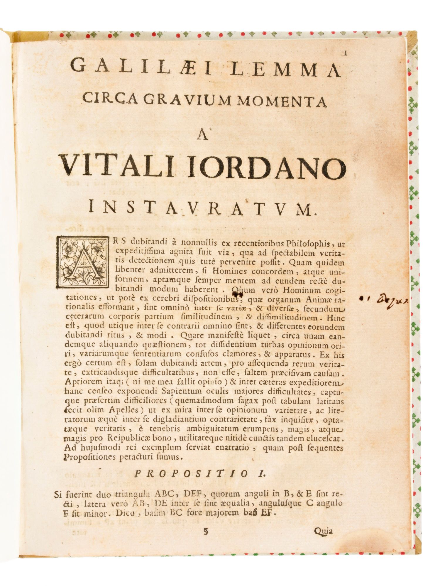 Galilaei lemma circa gravium momenta a Vitali Jordano instauratum, in Romae 1711. Rarissimo opuscolo del primo Settecento con teoremi di Galileo Galilei (1564-1642) reintrodotti dal matematico italiano Vitale Giordano (1633-1711). Elegante rilegatura post. in mezza pergamena con piatti rivestiti in carta decorata. Carte rifilate, con minuscole perdite alle numerazioni delle pagine. Pp. 18, (2).