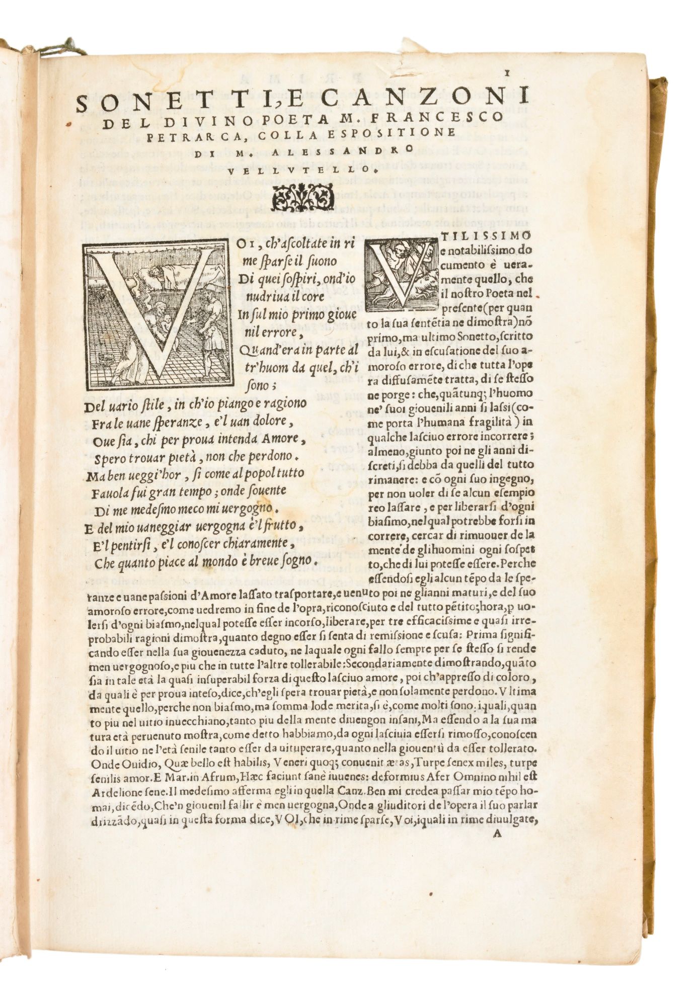 Commento al Canzoniere e ai Trionfi di Francesco Petrarca (1304-1374) del poeta e critico letterario Alessandro Vellutello (n. 1473). Edizione impressa in Venezia il 1552 per Gabriele Giolitto de Ferrari. Frontespizio xilografico restaurato (riapplicato su carta antica), ritratto del Petrarca con Laura alla c. *2 e mappa del sito di Valclusa alla c. *5, 6 vignette xilografiche nel testo dei Trionfi. Numerose capilettere. Marca tipografica al colophon. Rilegatura post. in piena pergamena antica con titoli manoscritti al dorso. Formato in-8°, cm. 22x15, cc. (8), 216. Buono esemplare con testo nitido, sporadiche fioriture, note e sottolineature in china antica.