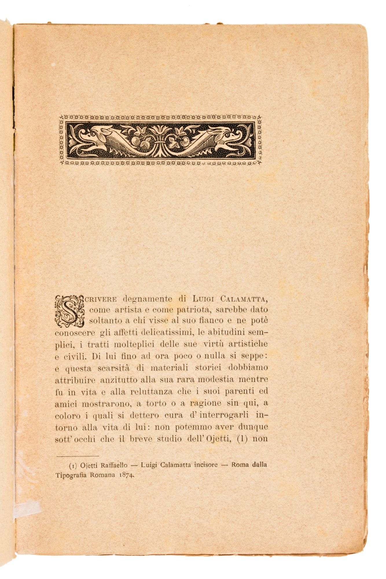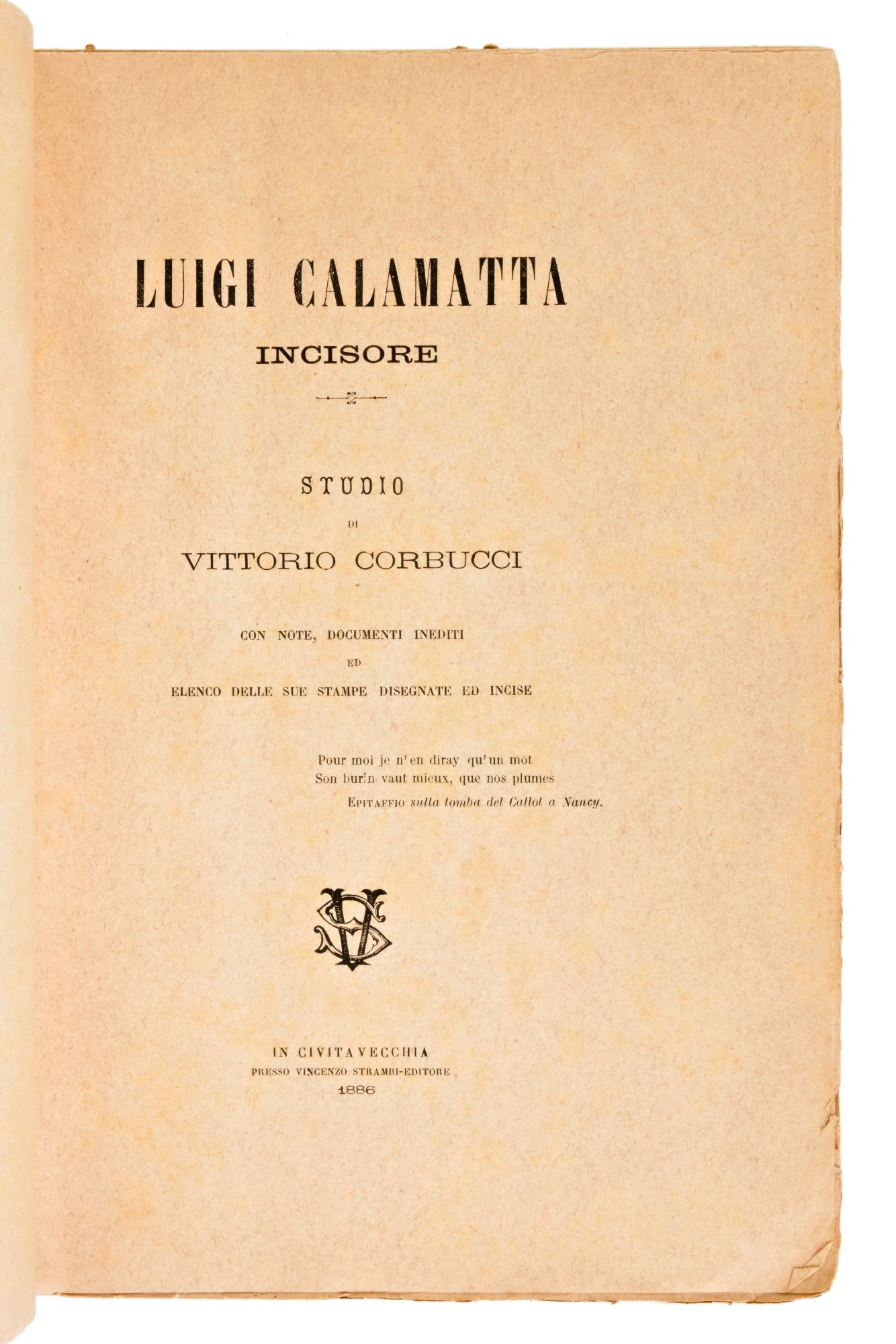 Luigi Calamatta incisore, studio di Vittorio Corbucci con note, documenti inediti ed elenco delle sue stampe disegnate ed incise. Rara prima edizione impressa in Civitavecchia il 1886 di sole 500 copie, per Vincenzo Strambi Editore. Monografia dell'incisore civitavecchiese Luigi Calamatta (1801-1869). Brossura editoriale intonsa, formato in-8°, pp. 189, (3). Restauro al dorso.