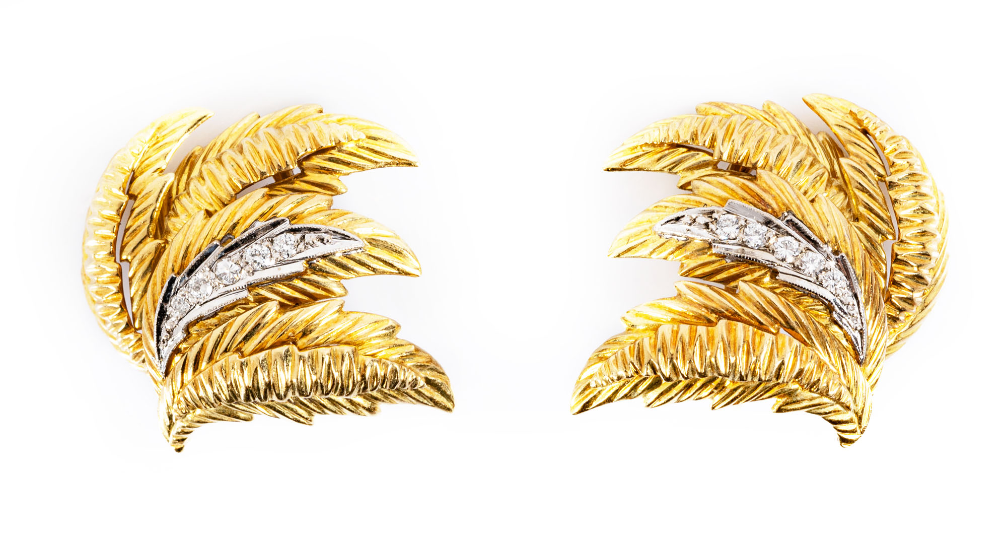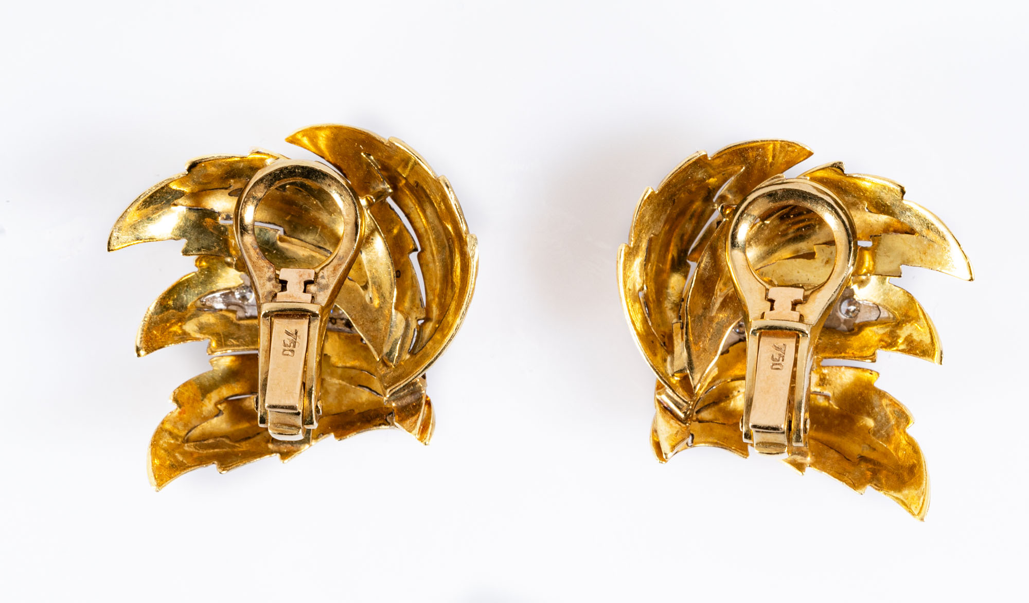 Orecchini a lobo in oro giallo 18ktA guisa di foglie, impreziositi da diamanti taglio brillante di 0.16 ct complessivi circaPeso gr 21