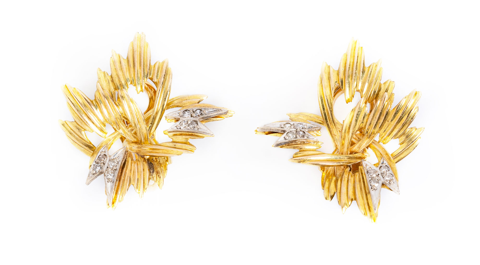 Orecchini a lobo in oro giallo 18ktA guisa di foglie, impreziositi da diamanti taglio brillante di 0.16 ct complessivi circaPeso gr 10