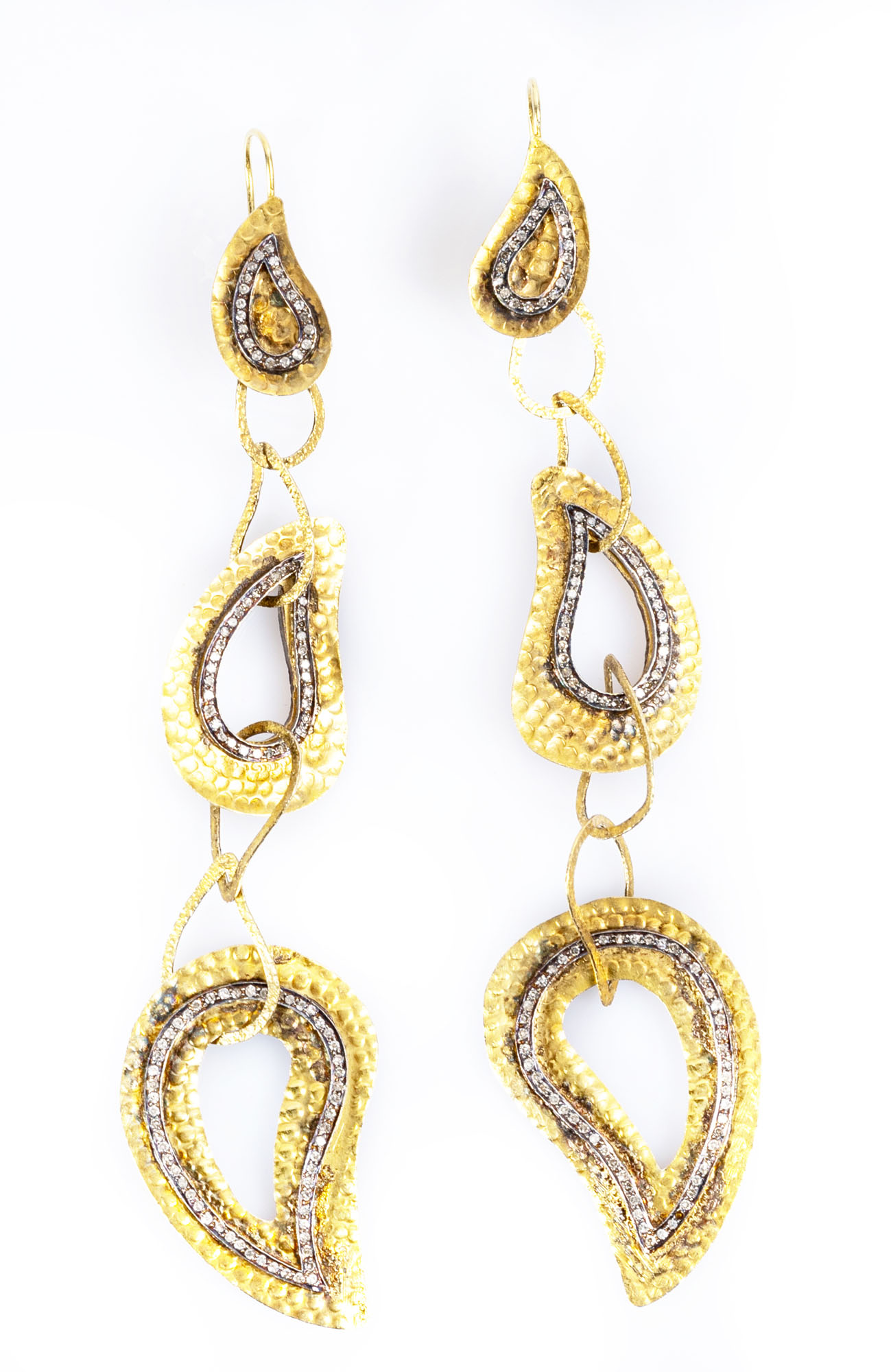 Orecchini pendenti in oro giallo 18ktImpreziositi da diamanti taglio brillante di 0.25ct complessivi circaLunghezza 6,3 cmPeso gr 29 circa