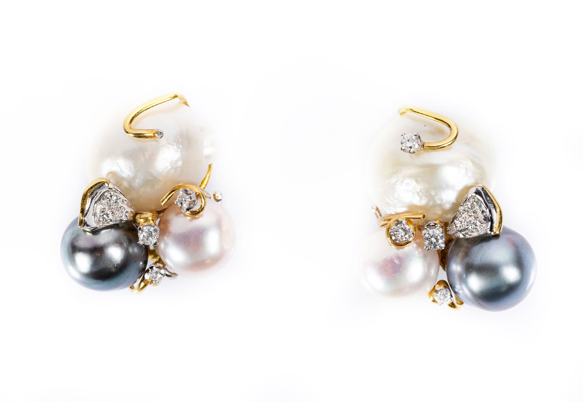 Orecchini a lobo in oro giallo 18kt e perleCon perle barocche affiancate da una perla coltivata rosa e una grigiaMontatura a volute con diamanti di 0.40 ct complessivi circaPeso totale gr 26