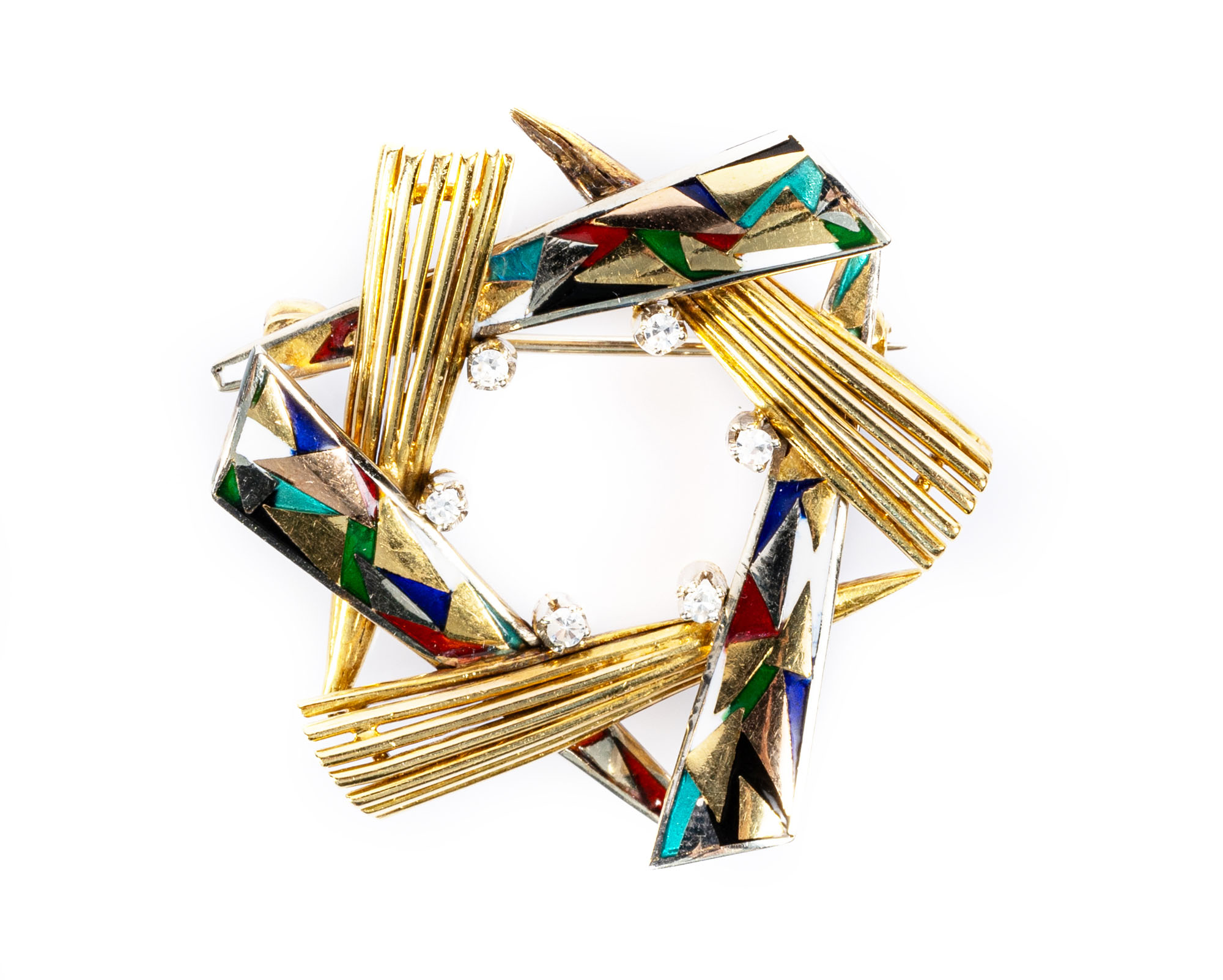 Spilla in oro giallo 18ktA guisa di stella con smalti colorati e sei diamanti taglio brillante di 0.20 ct complessivi circaDiametro 3,7 cm Peso gr 10,60