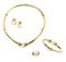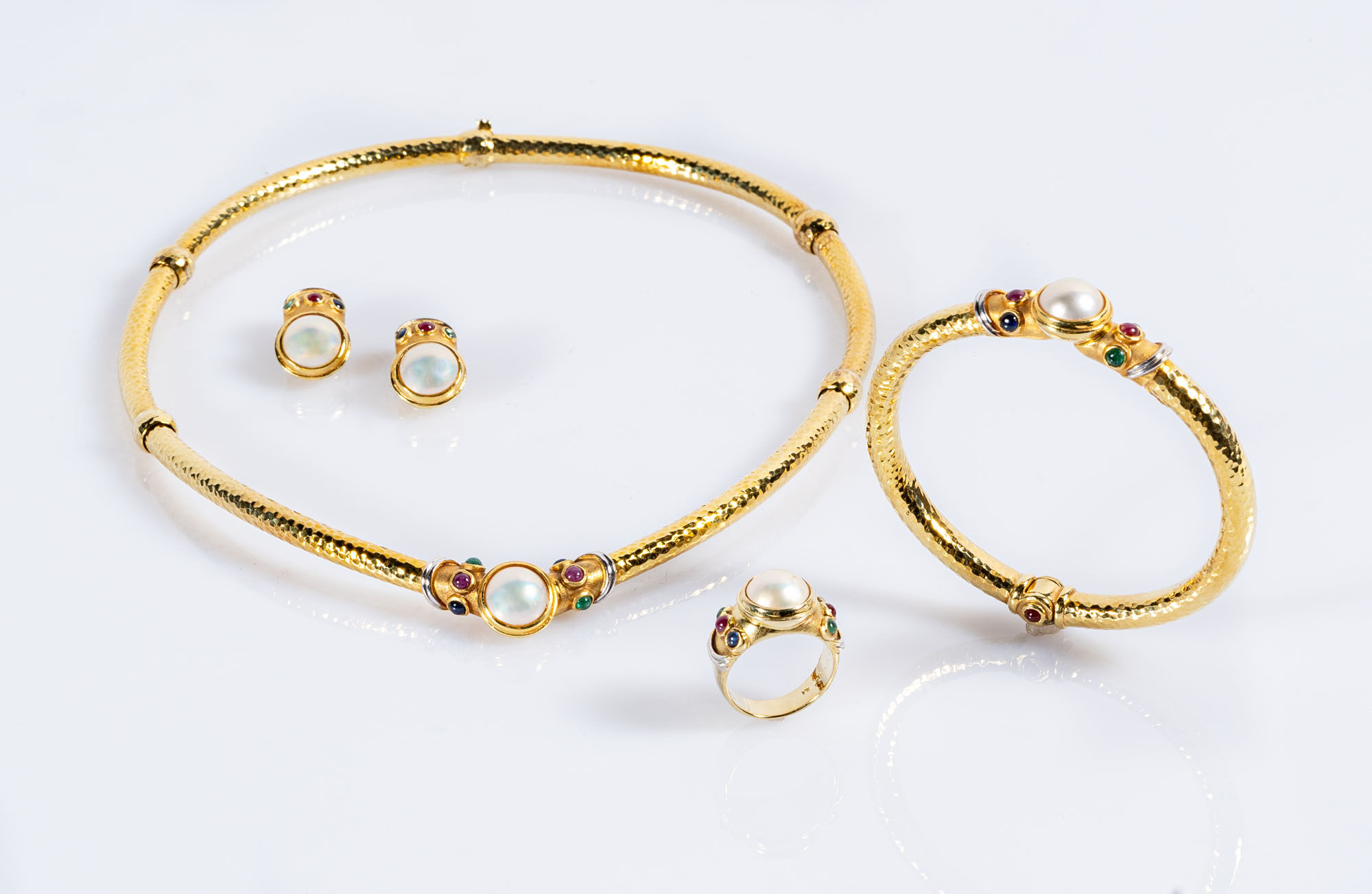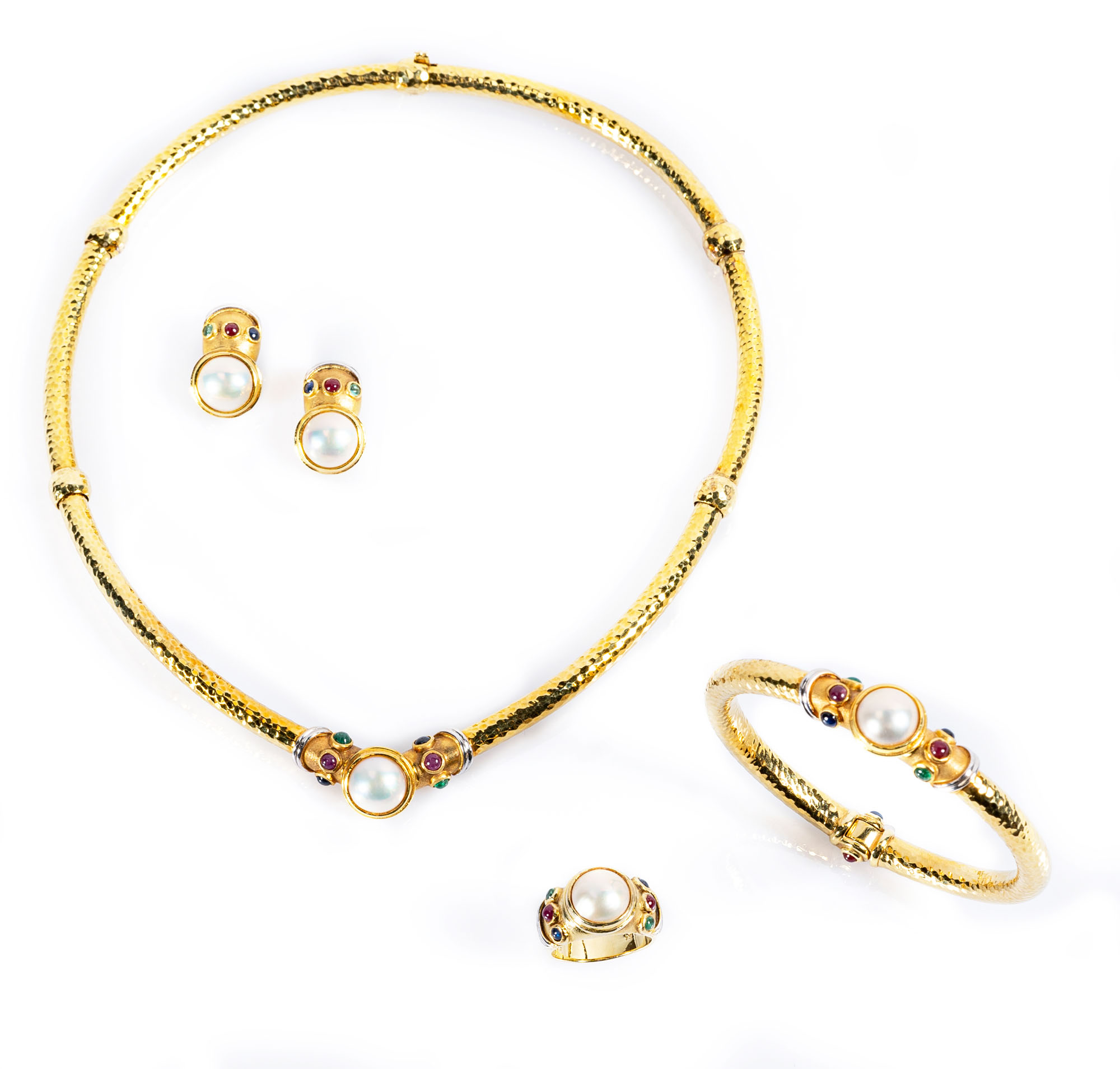 Parure in oro giallo martellato 14ktCon dettagli in oro bianco, impreziosita da mezze perle e pietre di coloreComposta da una collana semi rigida, un bracciale rigido, orecchini a lobo e un anelloMisura dell'anello 16 Lunghezza collana 40 cm Diametro del bracciale 6,5 cmPeso totale gr 97 circa
