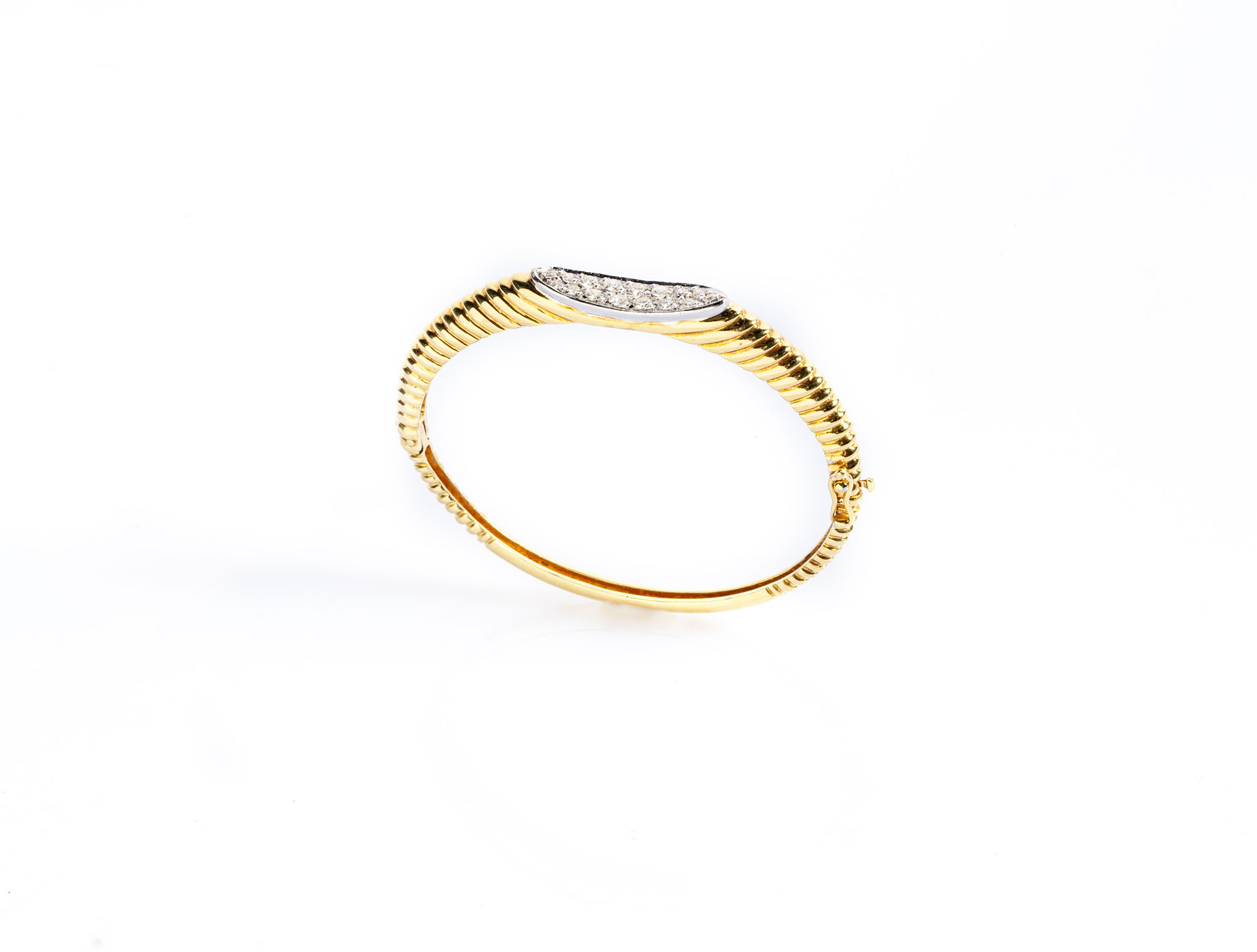 Bracciale rigido in oro giallo 18ktImpreziosito da una forma ovale in diamanti di taglio brillante di 0.70 ct complessivi circaDiametro 5,7 cmPeso gr 22