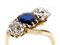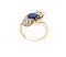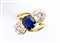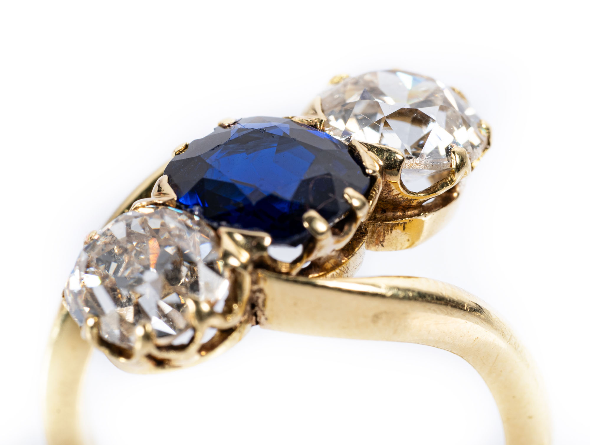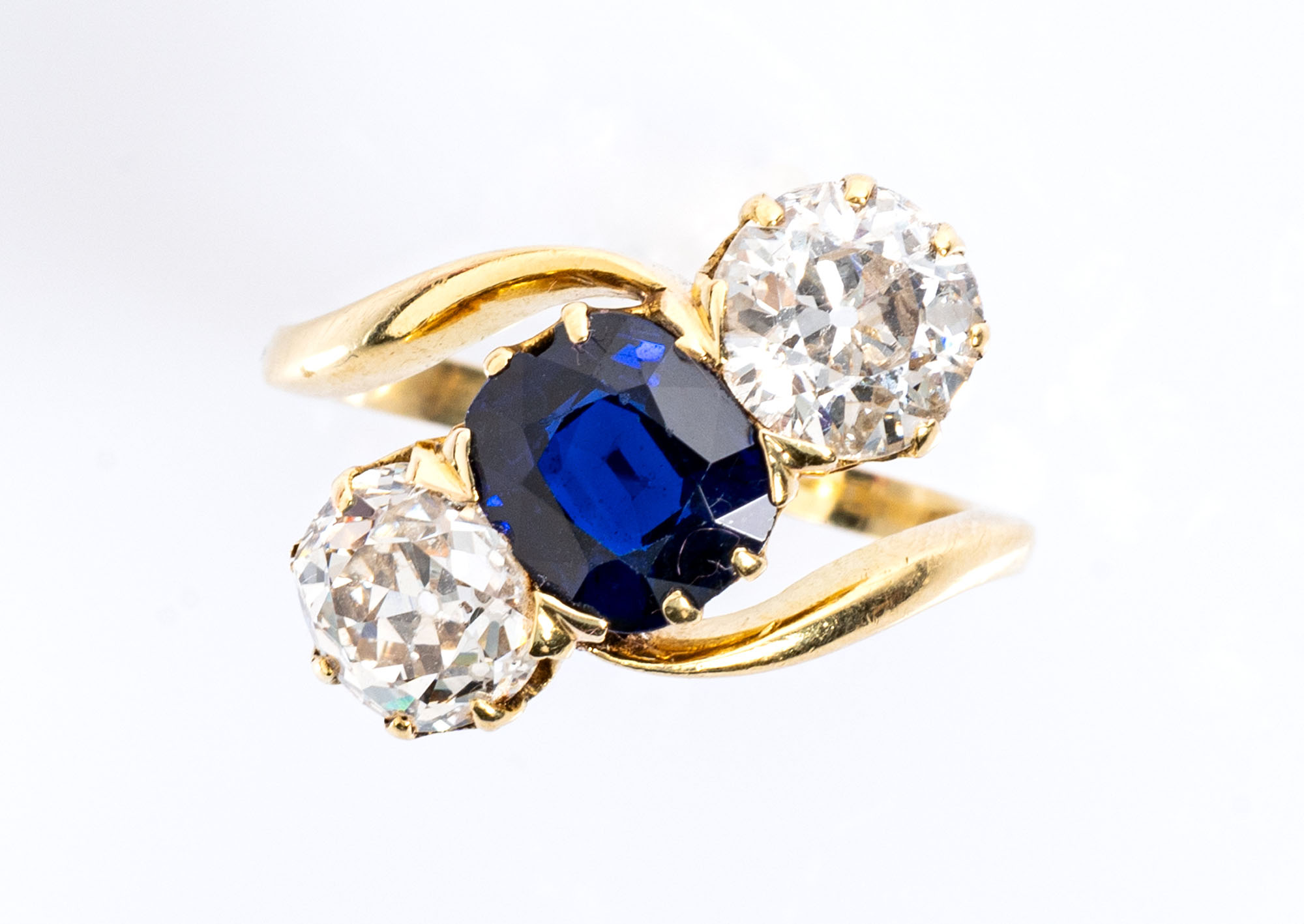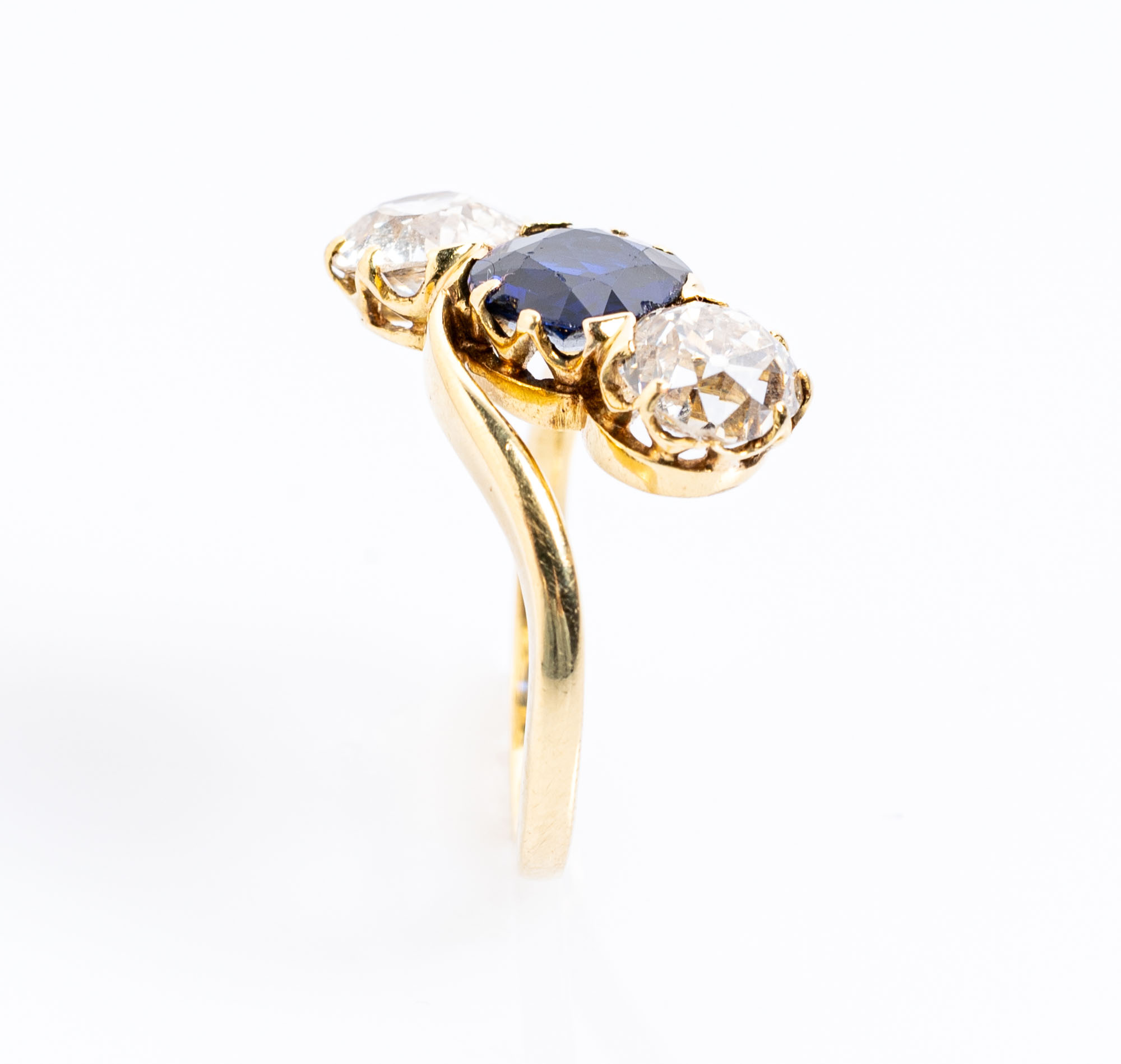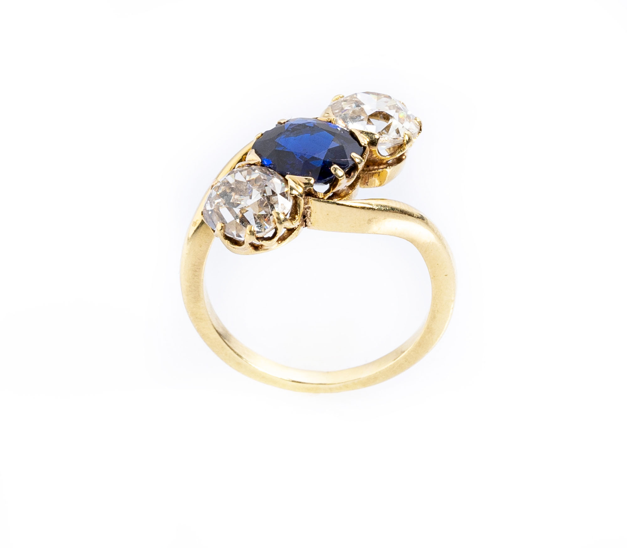 Anello in oro giallo 18kt e zaffiroCon uno zaffiro centrale taglio ovale di 1.40 ct circa, affiancato da due diamanti taglio antico di 1.11 e 1.18 ct circaMisura 11,5Peso totale gr 5