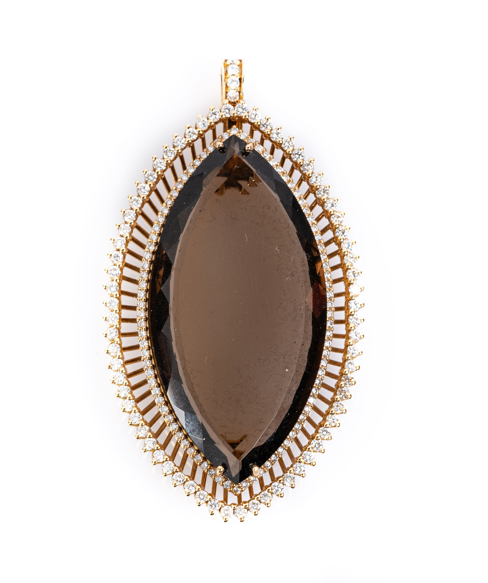 Pendente in oro rosa 18kt e quarzo fuméCon diamanti di 1.75 ct complessivi circaLunghezza 5,5 cmPeso totale gr 17