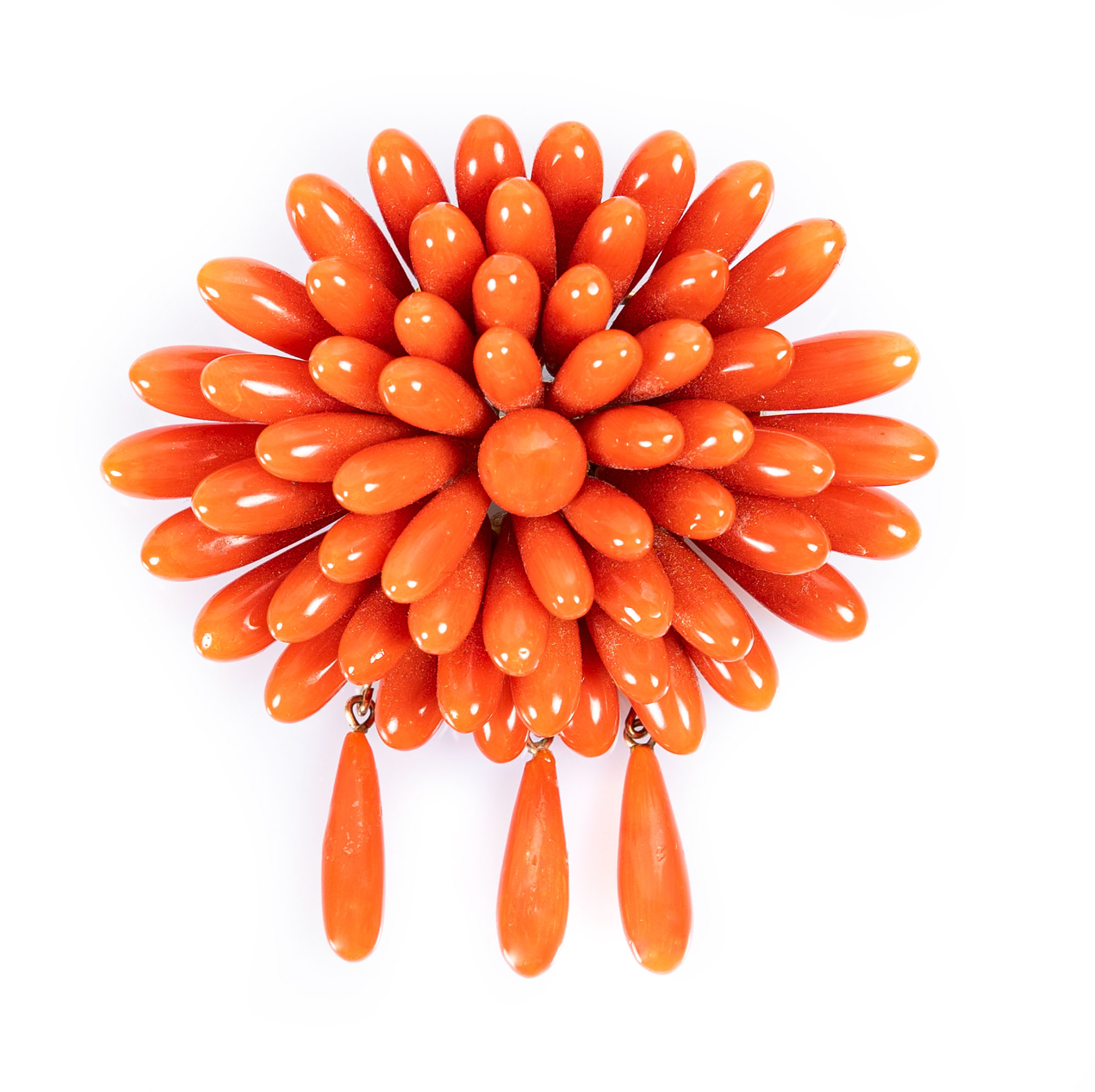 Spilla in oro giallo 18kt e corallo rossoLarghezza 5,5 cmPeso totale gr 28