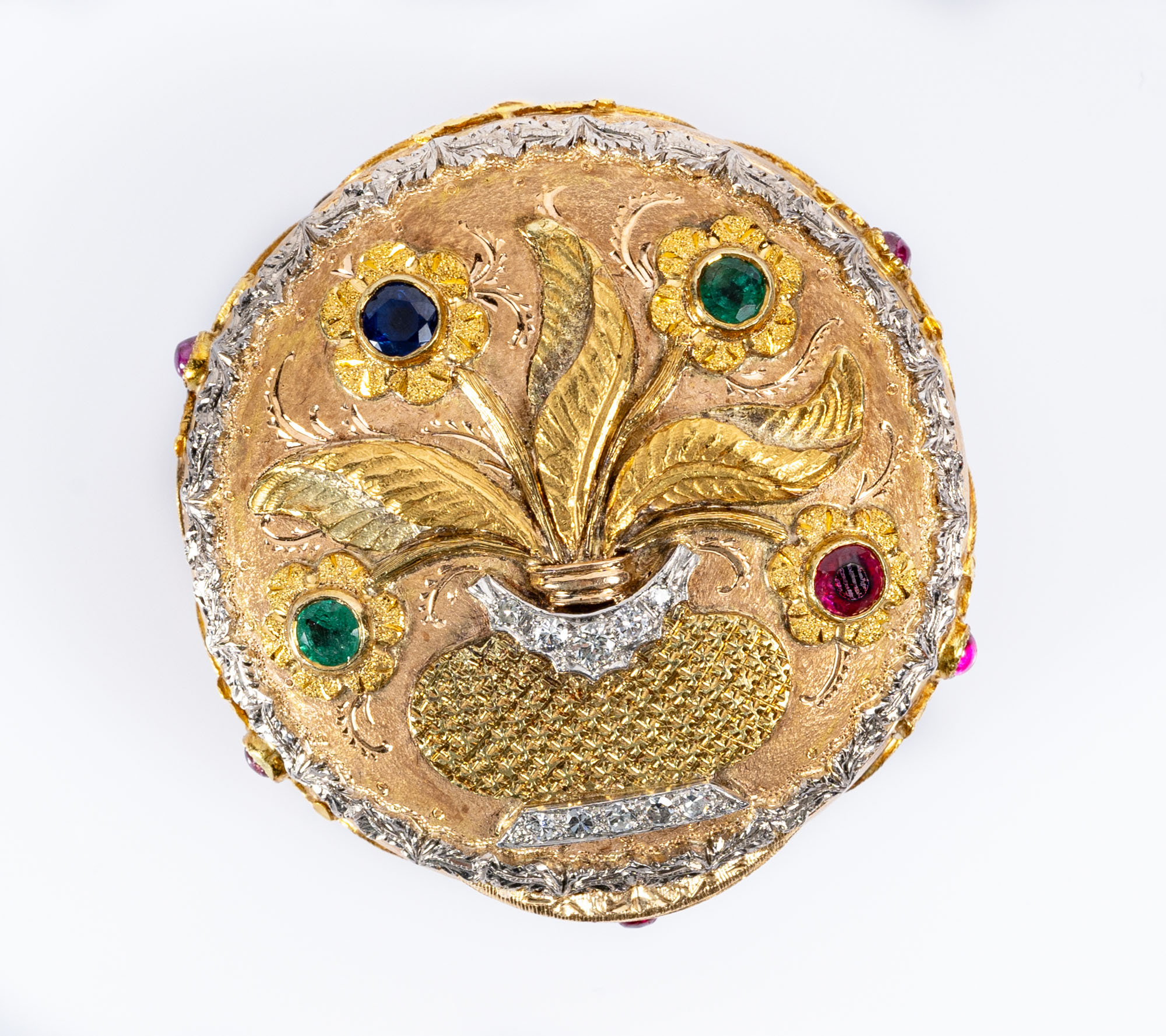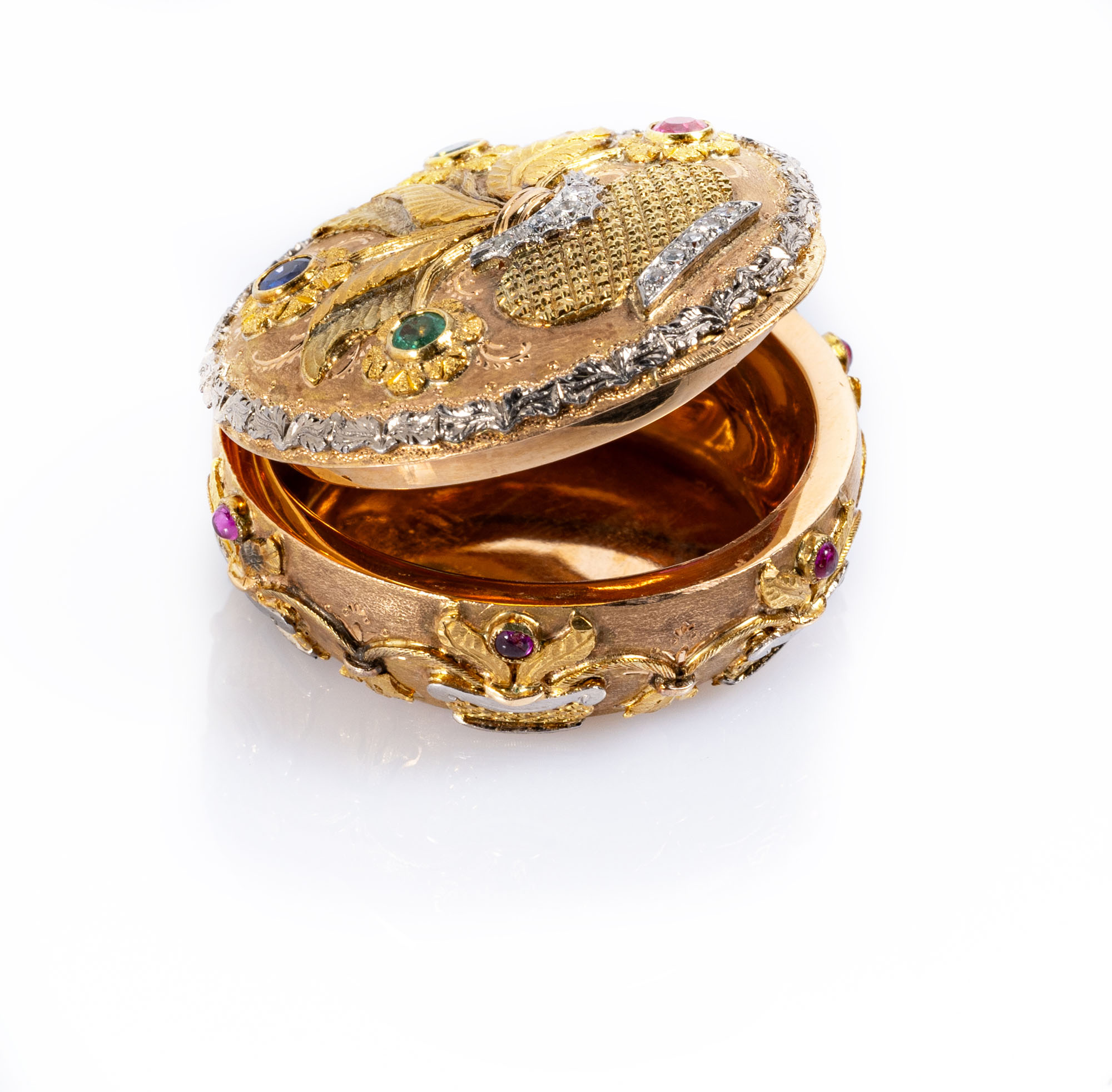 Scatola porta pillole in oro giallo 18ktImpreziosita da diamanti e pietre di coloreDiametro 3,5 cm Peso gr 37 circa