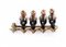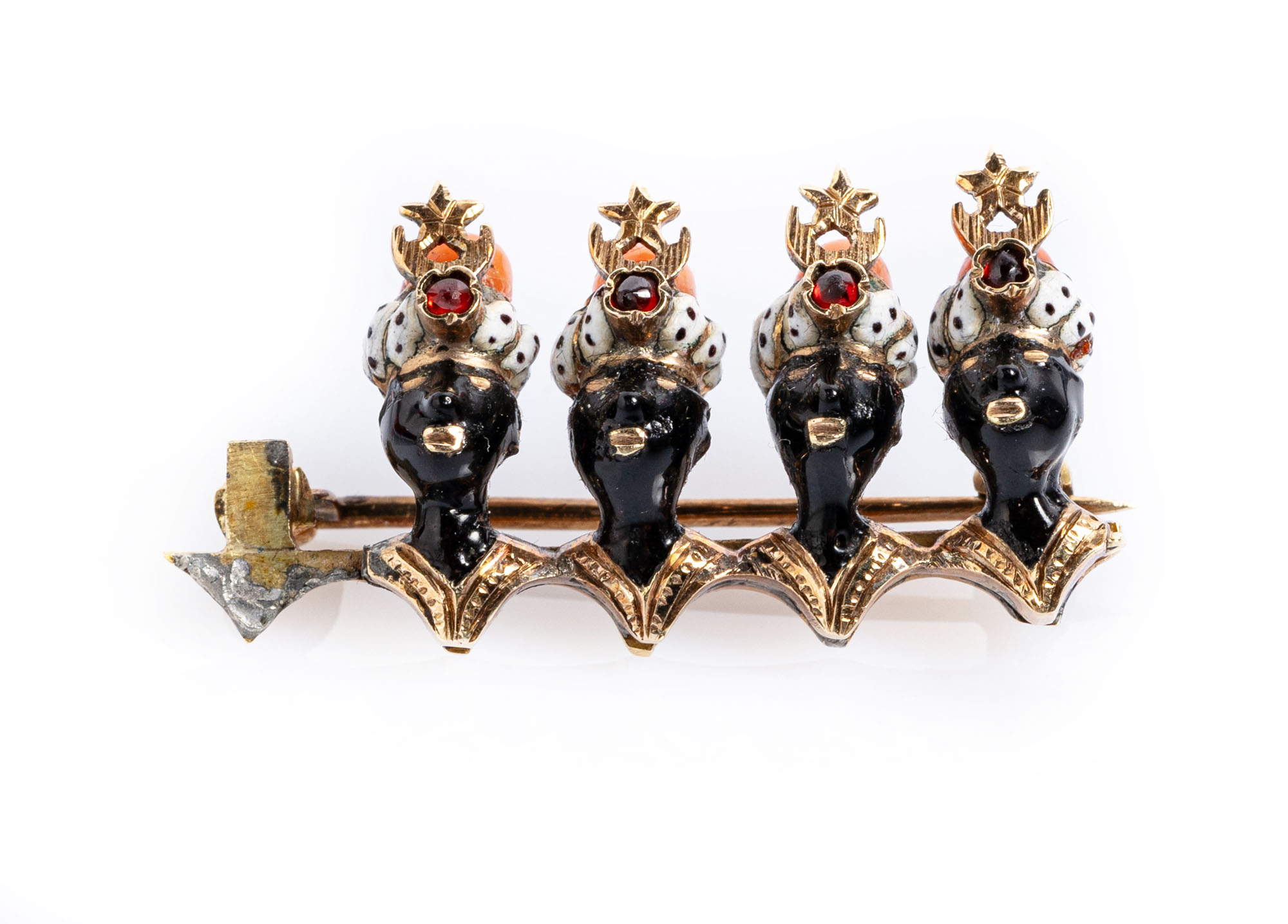 Spilla in oro giallo 18kt, smalto e coralloRaffigurante quattro piccoli moriLunghezza 3,3 cmPeso gr 5,64