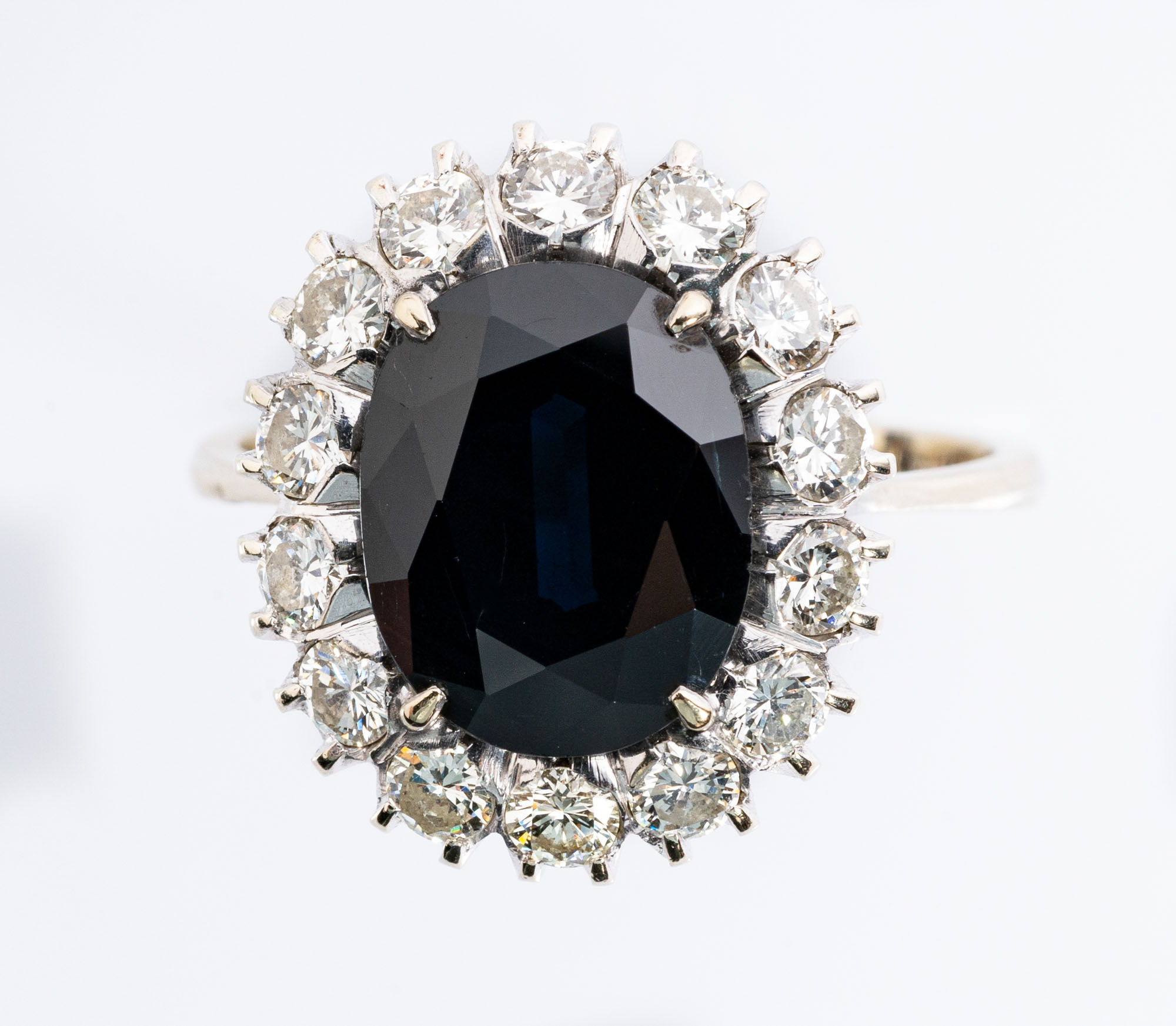 Anello in oro bianco 18kt, diamanti e zaffiroCon zaffiro taglio ovale di 5 ct circa e diamanti di 0.80 ct complessivi circaMisura 19Peso totale gr 5,95