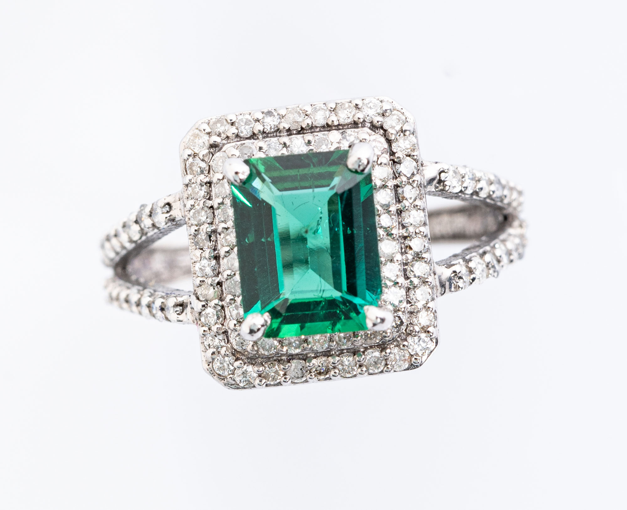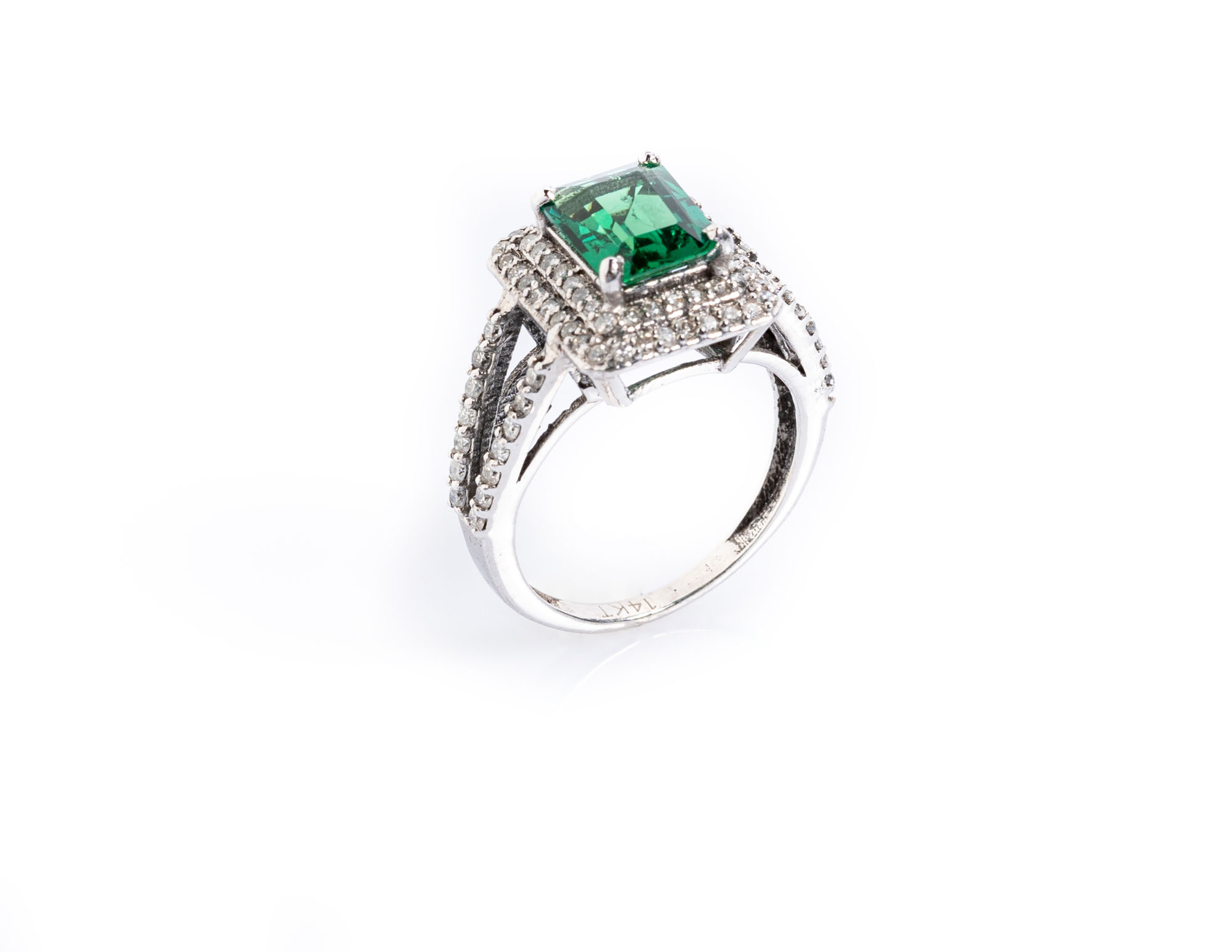 Anello in oro bianco 14kt e smeraldoCon smeraldo taglio rettangolare di 1.40 ct e diamanti taglio brillante di 0.50 ct circaMisura 14Peso totale gr 3 circa