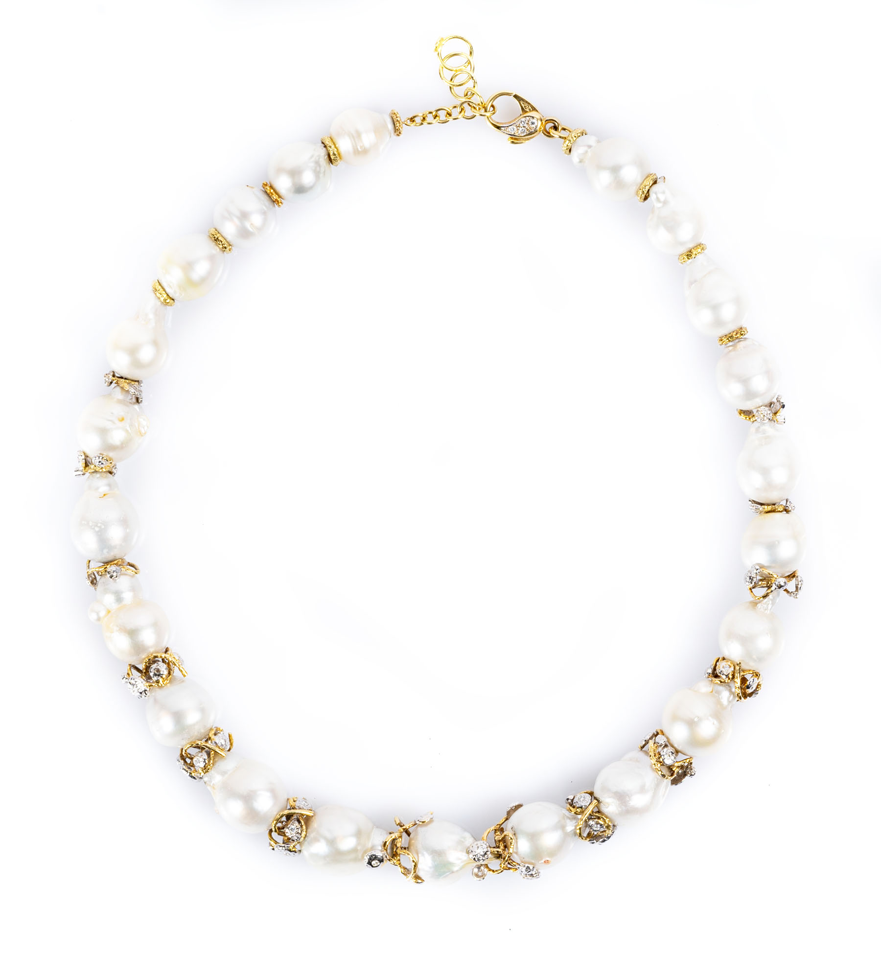 Collana in oro bicolore 18kt e perleCon perle barocche impreziosita da distanziatori in oro bianco, giallo e diamanti a motivo floreale di 1 ct complessivo circaLunghezza 51 cm circaPeso totale gr 156 circa