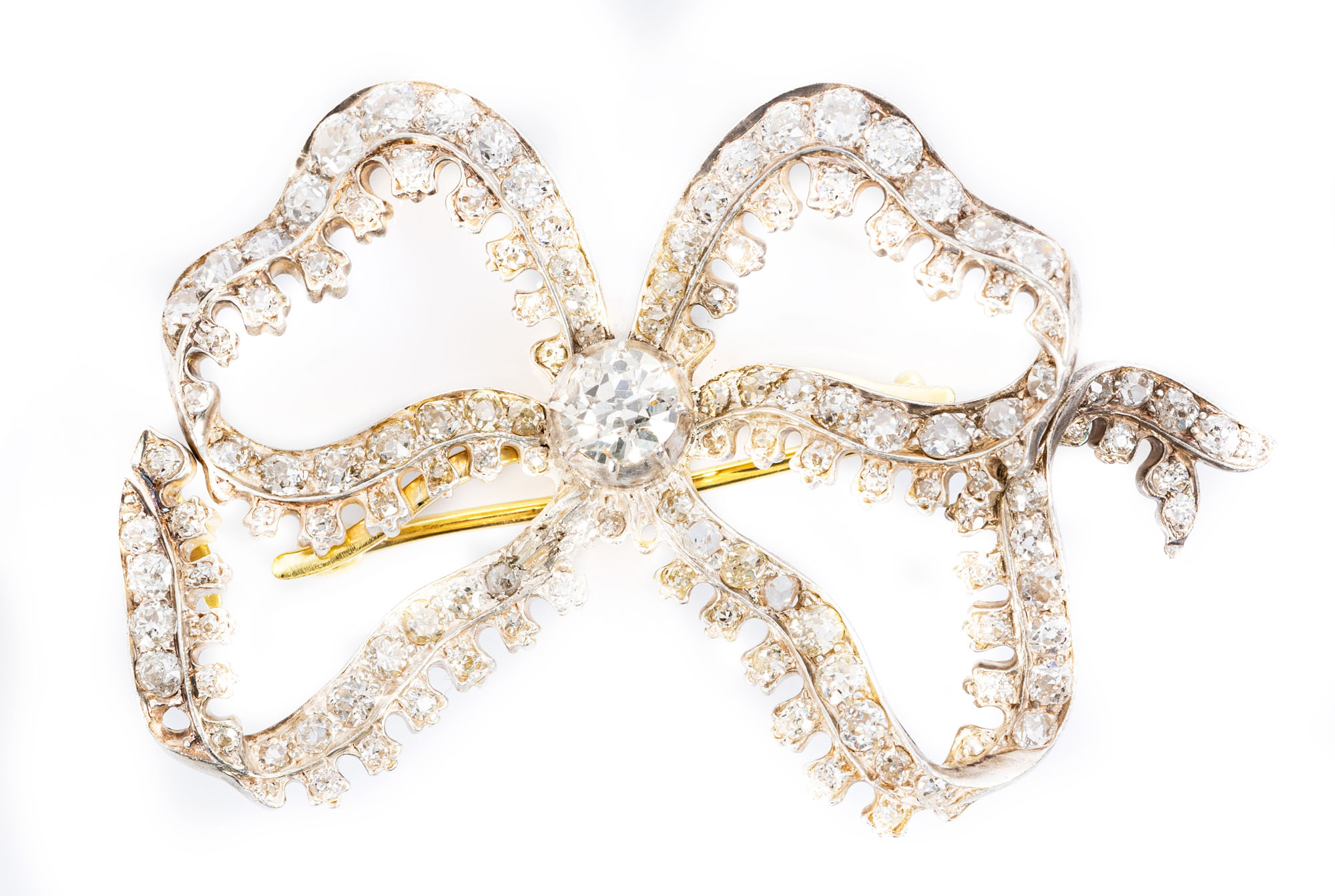 Spilla in oro 18kt e argento con diamantiA guisa di fiocco con diamante centrale di 1.20 ct circaDiamanti complessivi 5 ct circaLarghezza 5,5 cmPeso totale gr 18