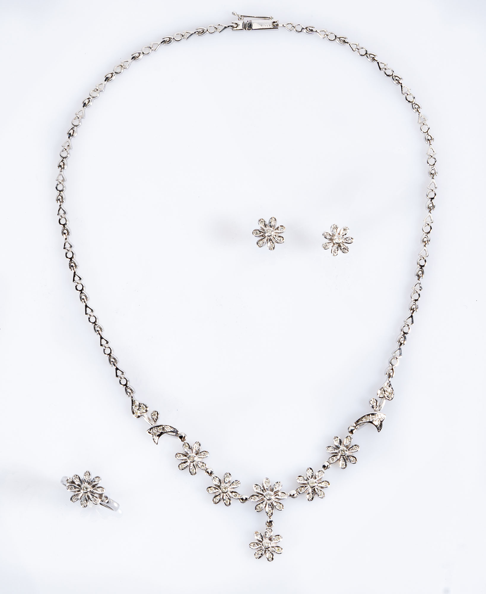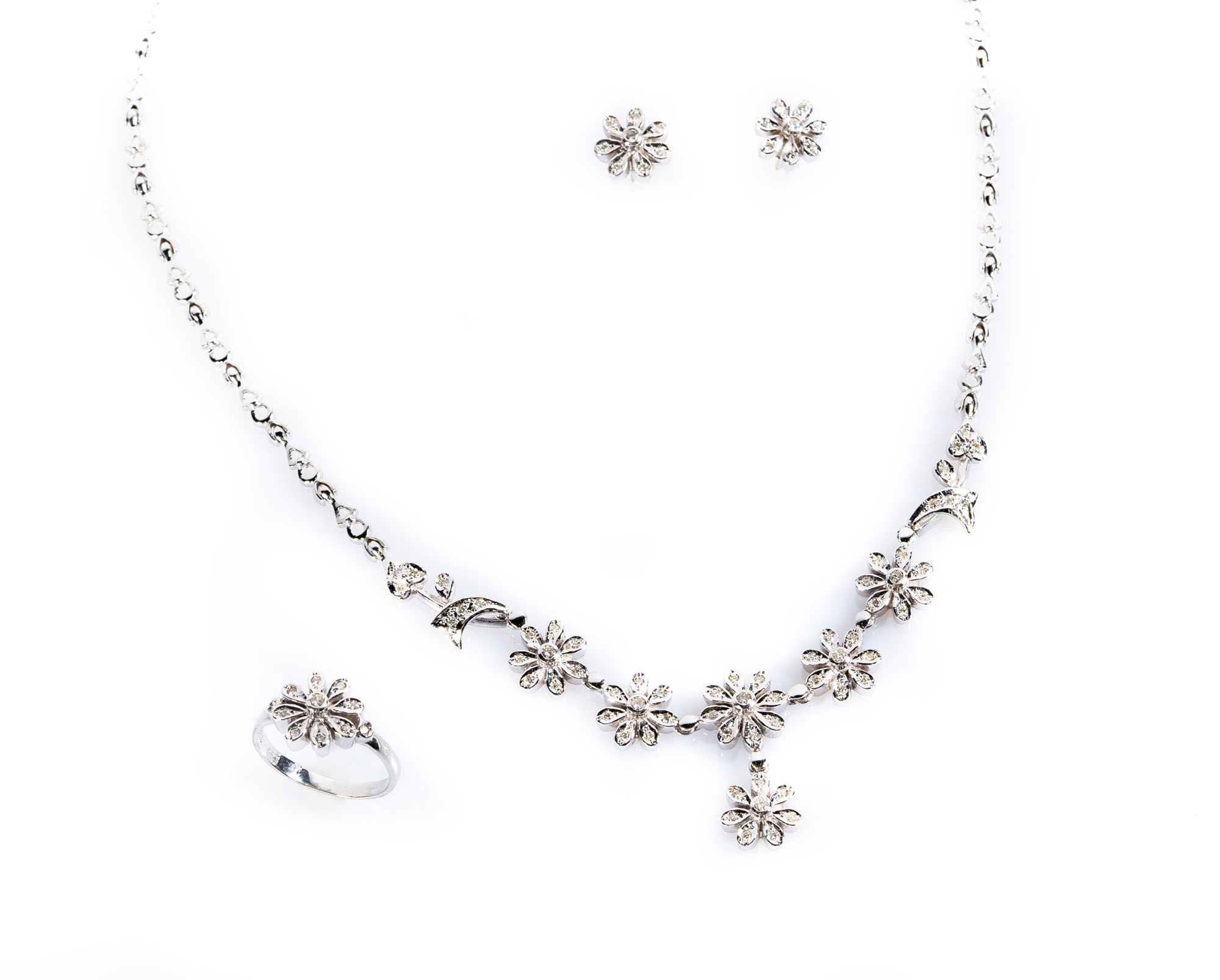 Parure in oro bianco 18kt e diamantiA motivo floreale, composta da collana, orecchini a lobo e anelloDiamanti complessivi 1.70 ct circaLunghezza collana 40 cm circaMisura anello 14Peso totale gr 34