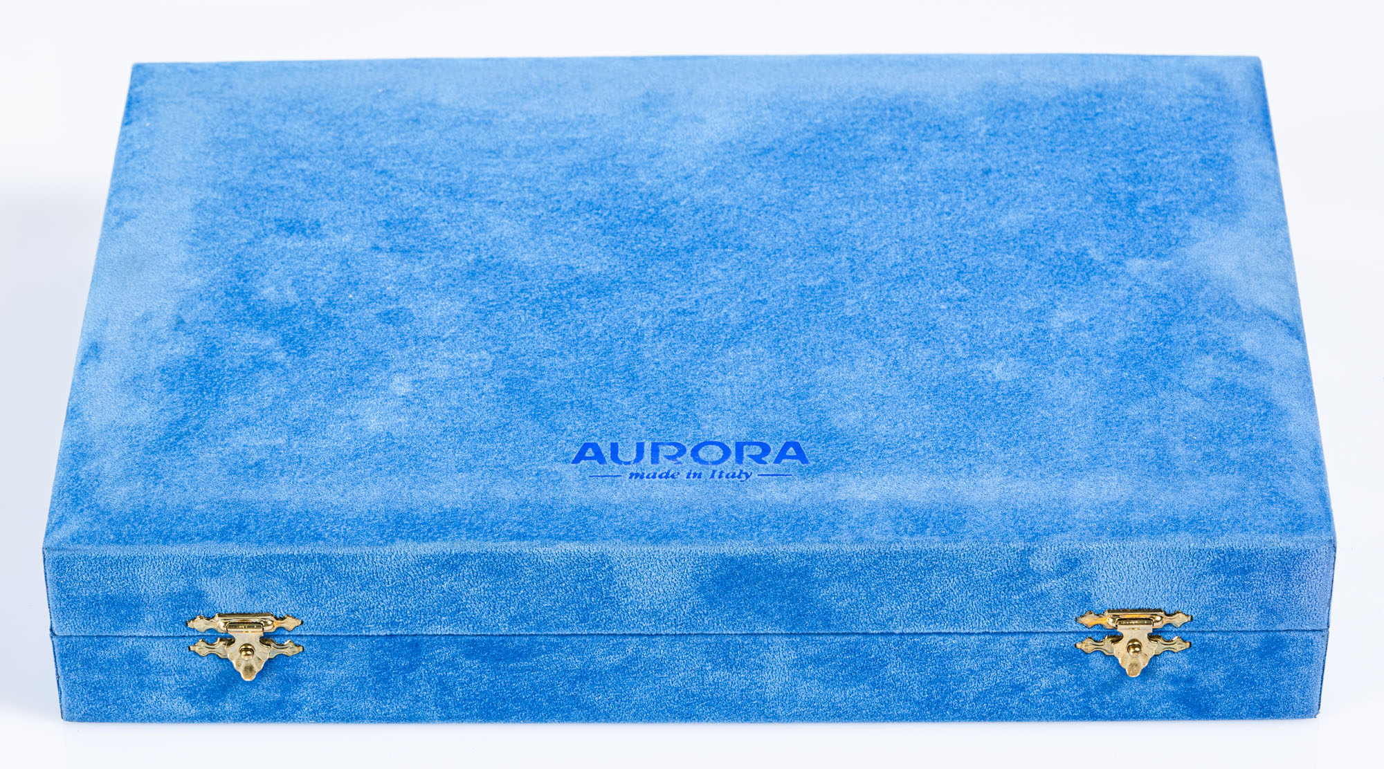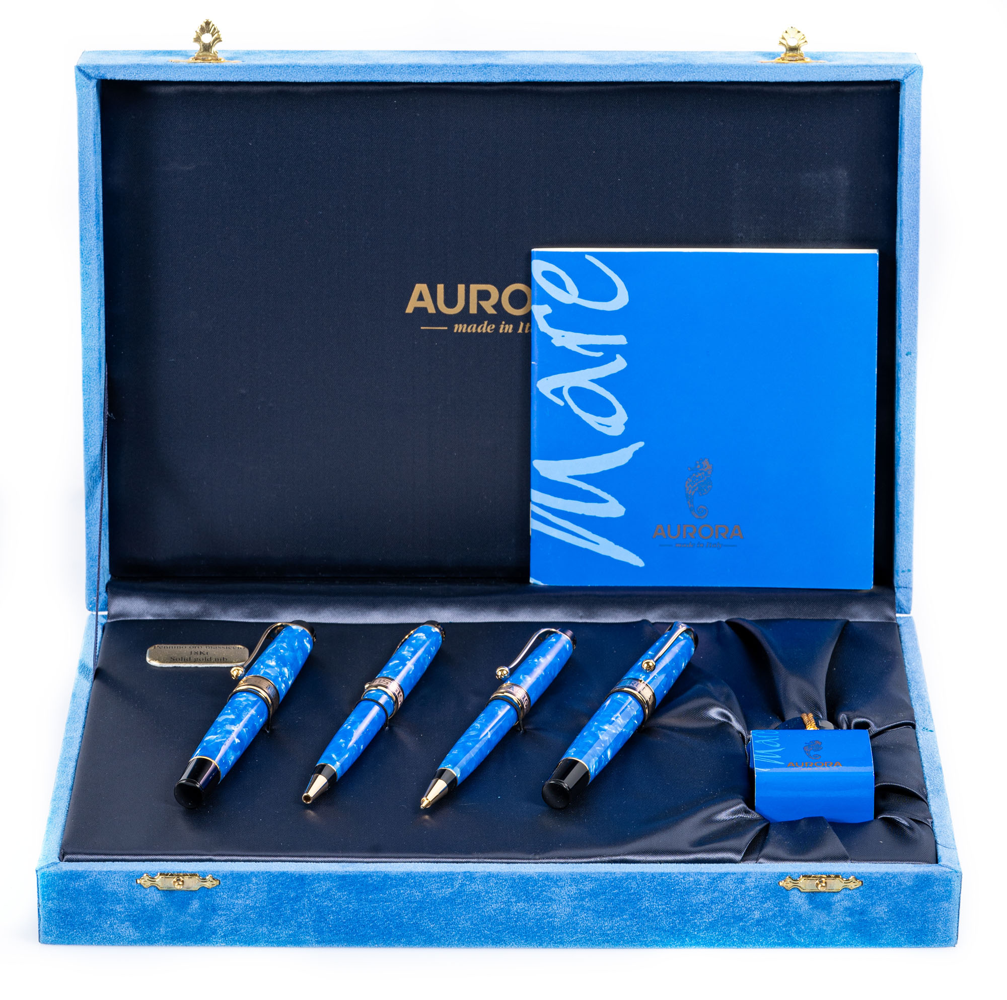 Aurora Optima Quartetto MareCofanetto contenente una penna roller, una penna a sfera, una matita meccanica e una penna stilografica con pennino punta M in oro 18ktN.0000/7500Calamaio inclusoCon scatola e garanziaPROVENIENZA:Collezione privata di Aurora
