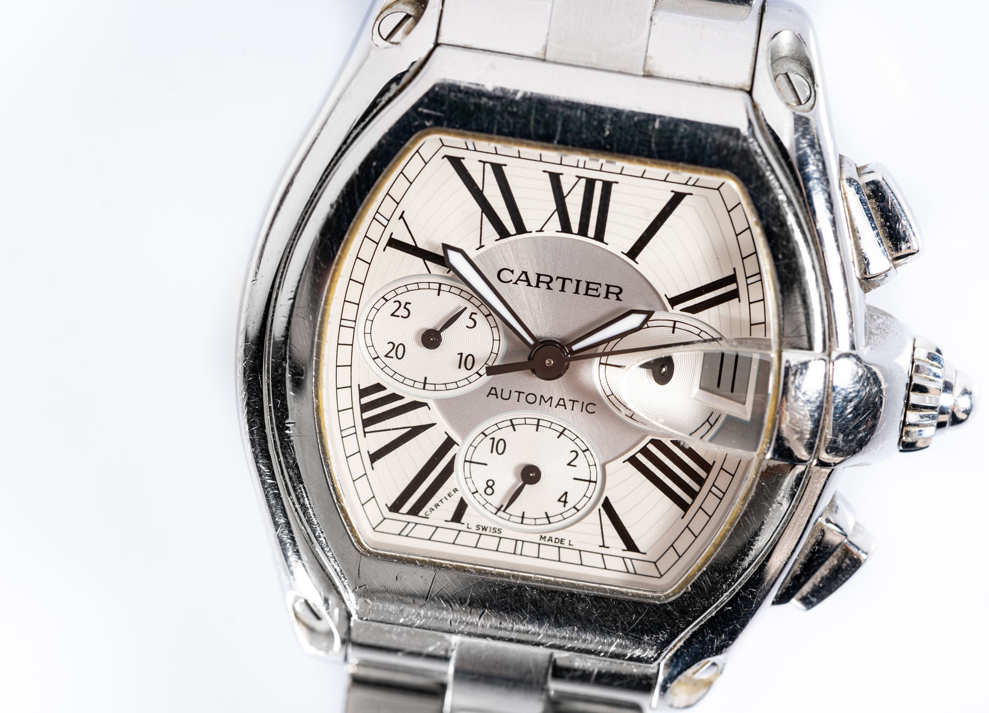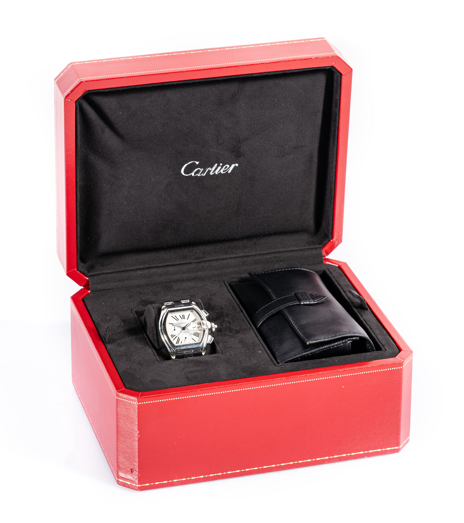 Cartier - Roadster ChronographRef. 2618 Cassa in acciaio Quadrante bianco argenté con datarioDimensioni 47 x 40 mmMovimento automaticoVetro zaffiroCinturino in acciaio firmato Cartier con chiusura a scomparsa Con scatola, garanzia e due cinturini di ricambio