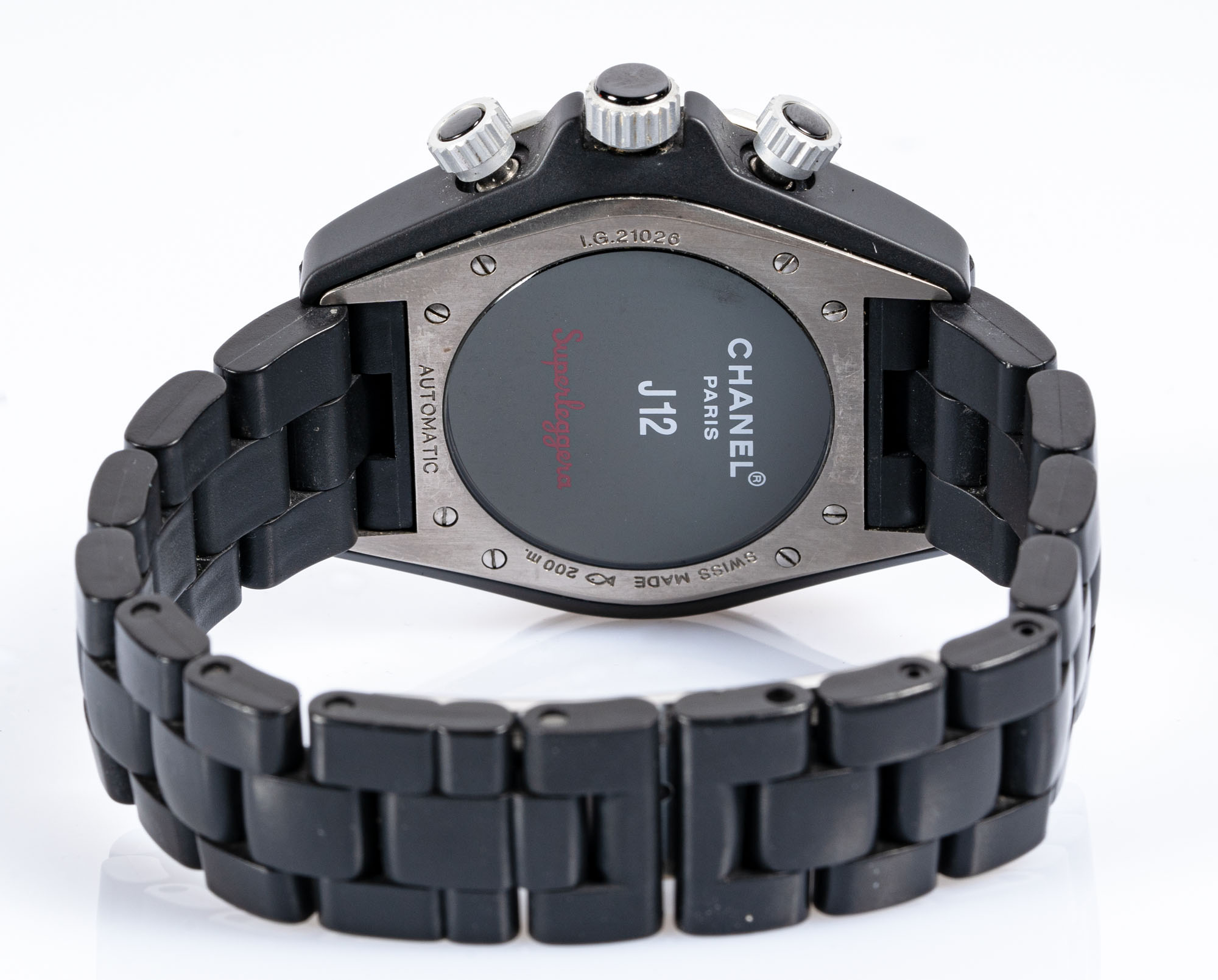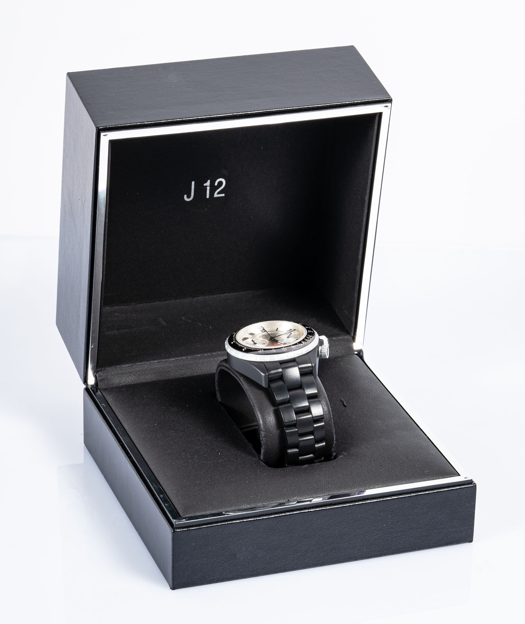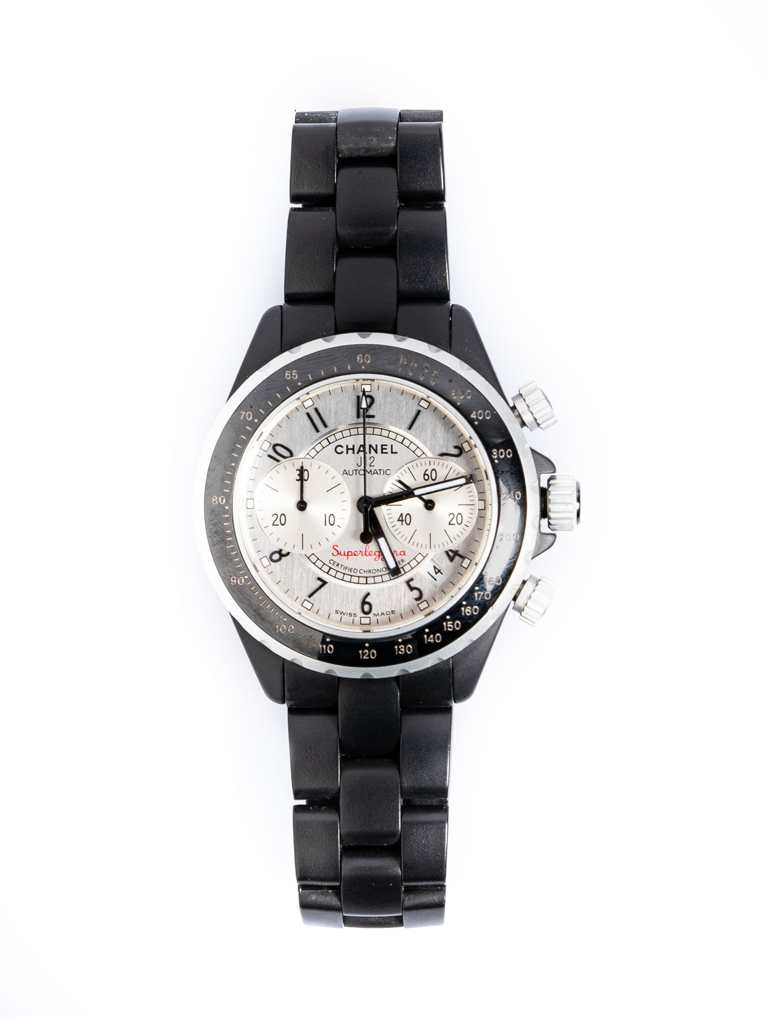 Chanel - J12 SuperleggeraCassa in ceramica nera satinataQuadrante argentato con doppio contatore e datario a finestrella tra le ore 4 e le ore 5Corona a vite e pulsantiDimensione 41 mmMovimento cronografo automatico Cinturino in caucciù nero con doppia fibbia déployante ChanelScatola originale e maglia aggiuntiva