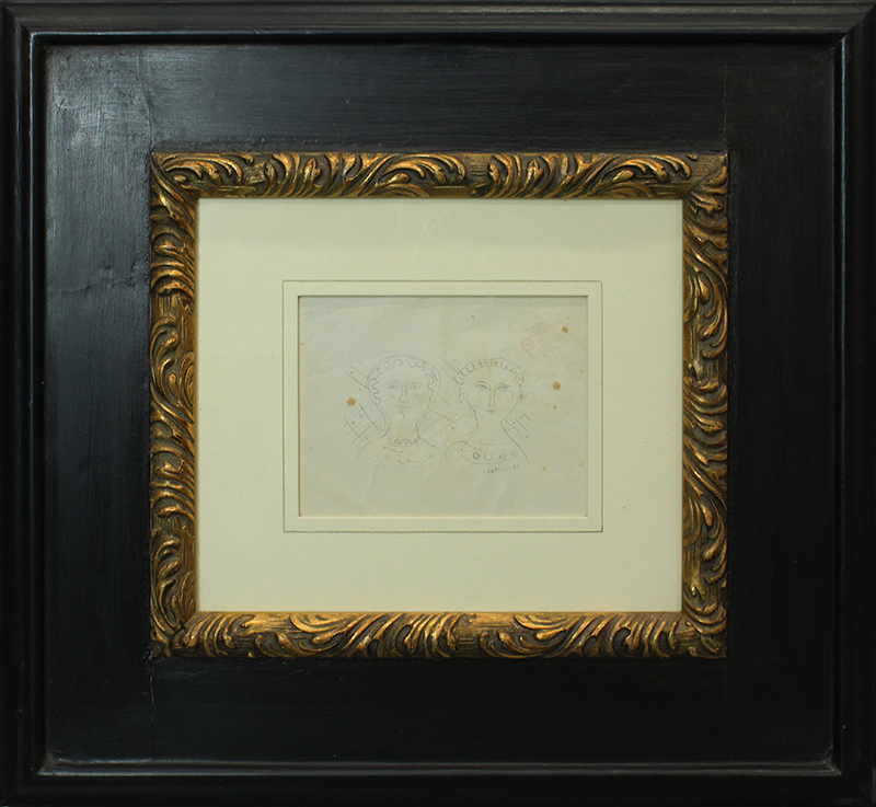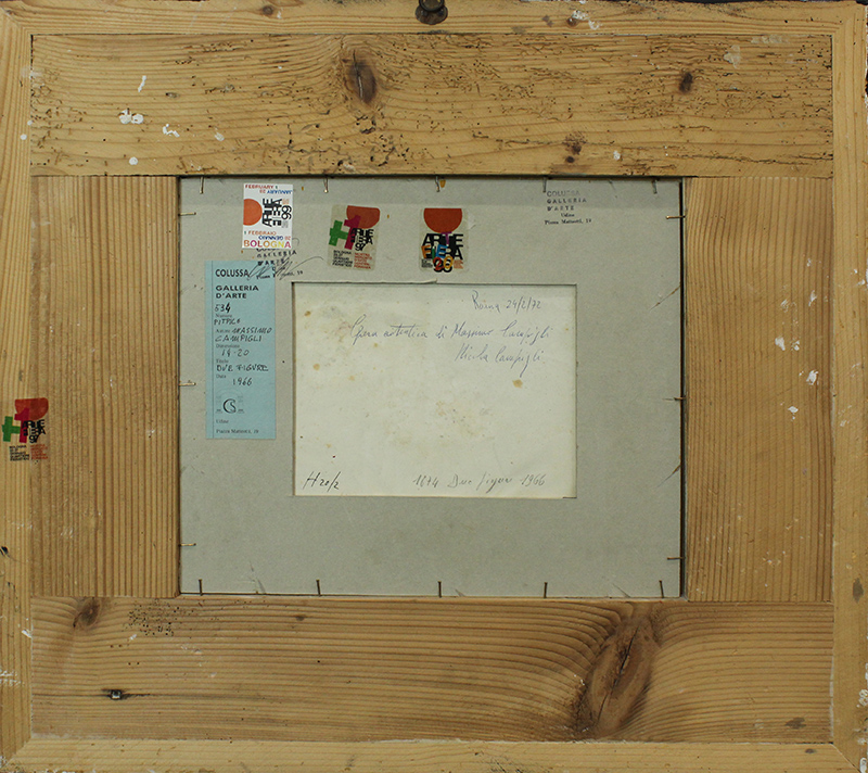 MASSIMO CAMPIGLI, "Due Figure", 1966, matita su cartoncino, 14x20 cm. Al fronte: in basso a destra firma e anno. Al verso: sul cartoncino dichiaraziome di autenticità di Nicola Campigli in data 24/02/1972, Roma; in basso a sinistra numero di archiviazione, a destra anno di esecuzione. Presenta leggera fioritura; in alto 3 etichette Fiera di Bologna 1997-1999-2000; a sinistra etichetta Galleri d'Arte Colussa con informazione e timbro in alto a destra Galleria Colussa. Opera con cornice.