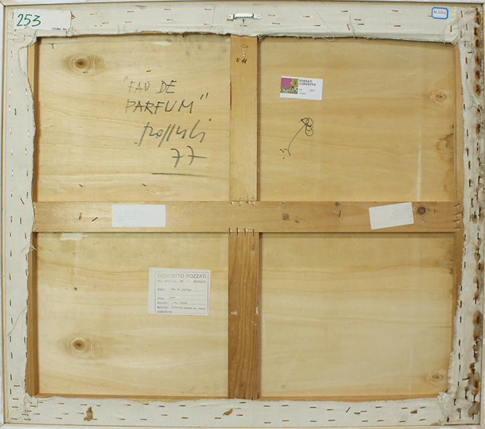 CONCETTO POZZATI, "Eau de parfum", 1977, tecnica mista su tela, cm 70x80, con cornice 73x83x4 cm, peso 5,35 kg. Opera archiviata dall'Archivio Generale al N°1407/06. Opera pubblicata nel Catalogo Generale a cura di Gianluca Re, Christian Maretti Editore Faenza, 2006, Tomo I, pag 85. Al verso: titolo, firma, anno in alto a sinistra, quattro etichette esplicative. Opera con cornice.