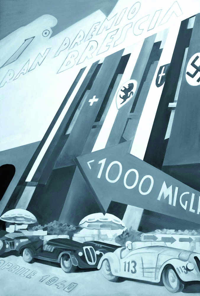 Firmato, datato. GIAN MARCO MONTESANO (1949) - " 1000 Miglia ", 2009, Olio su tela, cm. 150 x 100. Firmato e datato sul retro. Autentica dell'artista su fotografia. Pubblicato sul catalogo " Mille Miglia...d'arte ". Museo Santa Giulia, p. 17, 2009. Prov. Collezione Privata