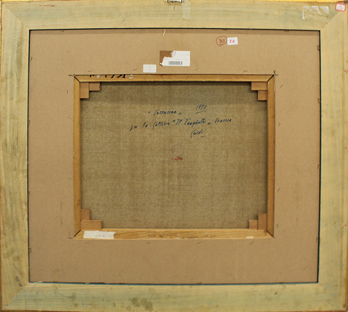 VIRGILIO GUIDI, "Terracina", 1970, olio su tela, cm 50x60, cm con cornice 85x96x4, peso 5 kg. Opera con autentica a cura Toni Toniato, Venezia, 28 ottobre 1996. Opera pubblicata sul Terzo Volume del Catalogo Generale a pag 1116. Al verso: titolo, anno, "La Galleria Il Traghetto Venezia", firma e timbro, in basso pubblicazione sul Catalogo Generale. Opera con cornice.