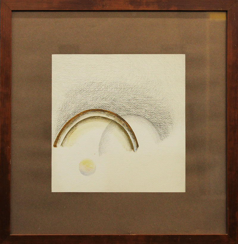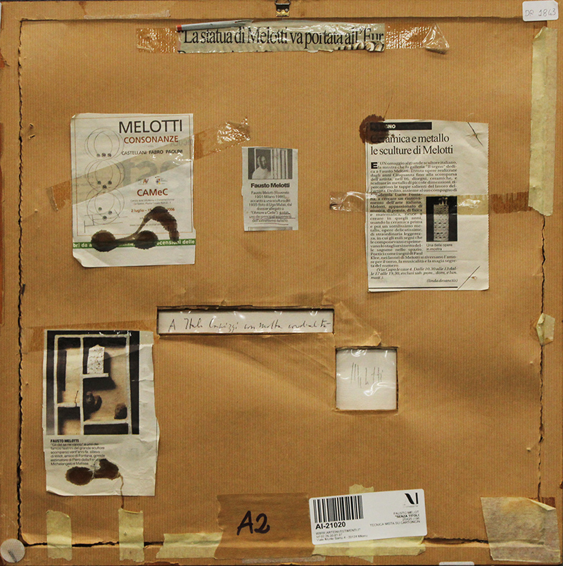 FAUSTO MELOTTI, 1980 circa, tecnica mista su cartoncino, dim 25x25, Opera archiviata dall'Archivio Fausto Melotti N°T80131 a cura di Marta Melotti in data 12/01/2020, certificato di provenienza di Arte Investimenti, Milano. Al verso: firma e dedica al centro, in alto inserto di giornale con su scritto "la statua di Melotti va portata all'Eur", a sinistra in alto inserto di giornale "Melotti Consonanze-Castellani, Fabro e Paolini alla CAMeC, in basso a sinistra inserto di giornale "Gli dei se ne vanno", in alto al centro inserto di giornale "Fausto Melotti in una foto di Ugo Mulas", in alto a destra inserto di giornale "ceraica e metallo le sculture di Melotti" giornale il Segno. Opera con cornice.