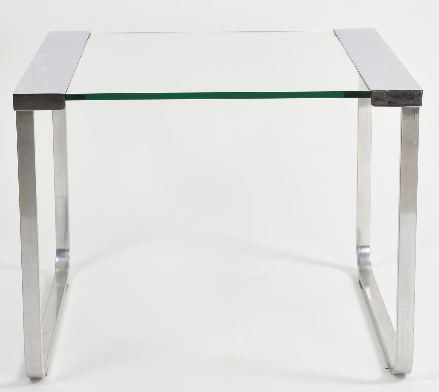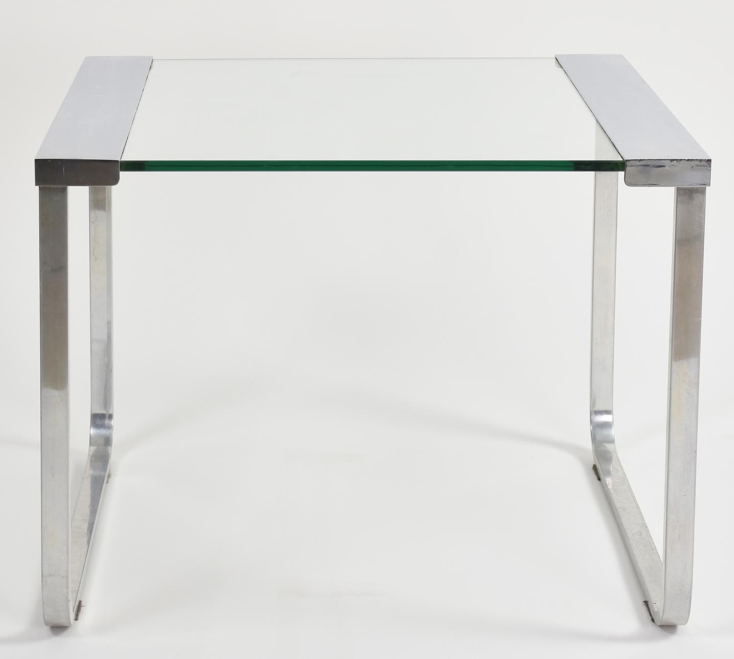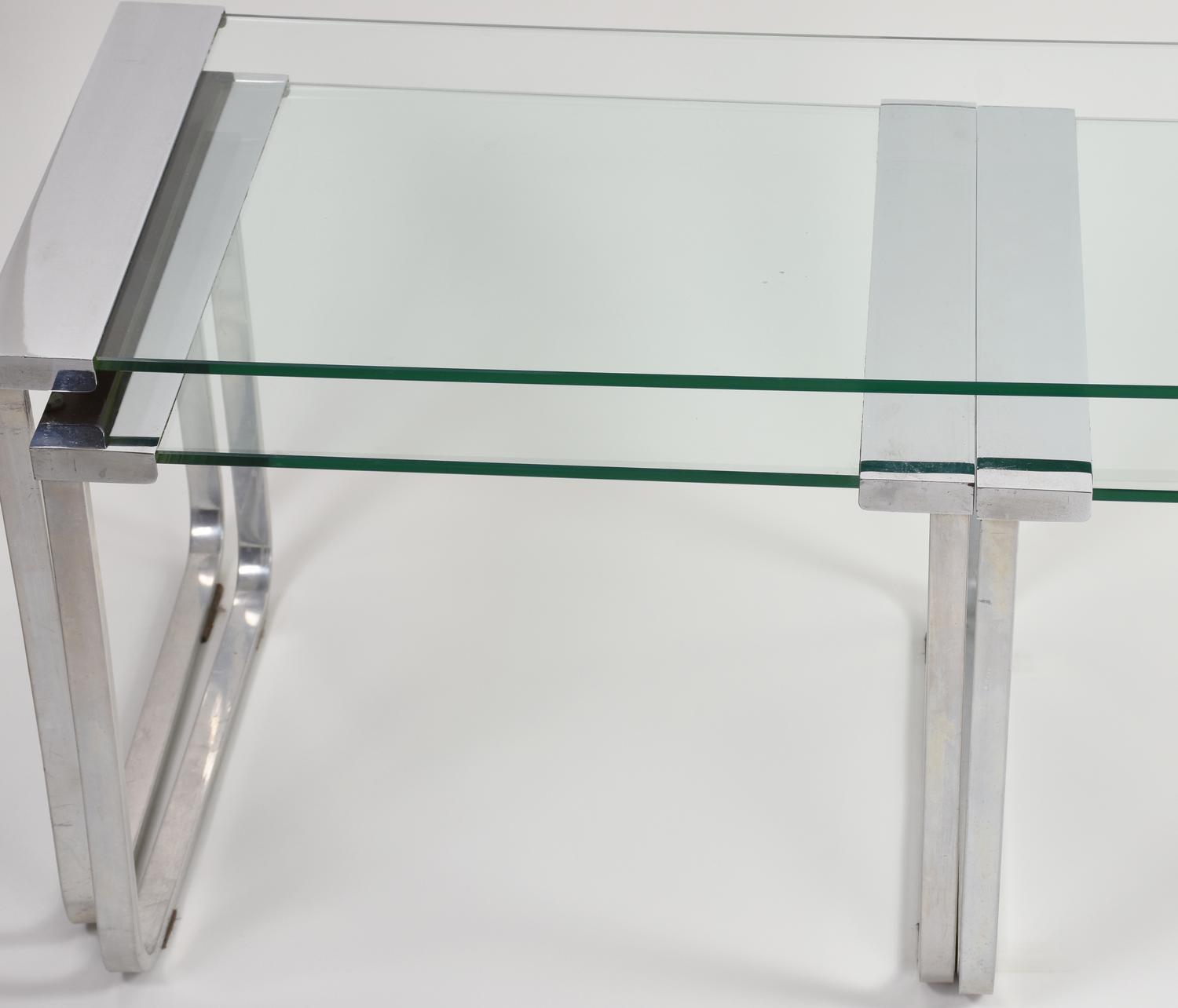 set componibile di tre tavolini con ripiano in vetro e struttura in metallo cromato