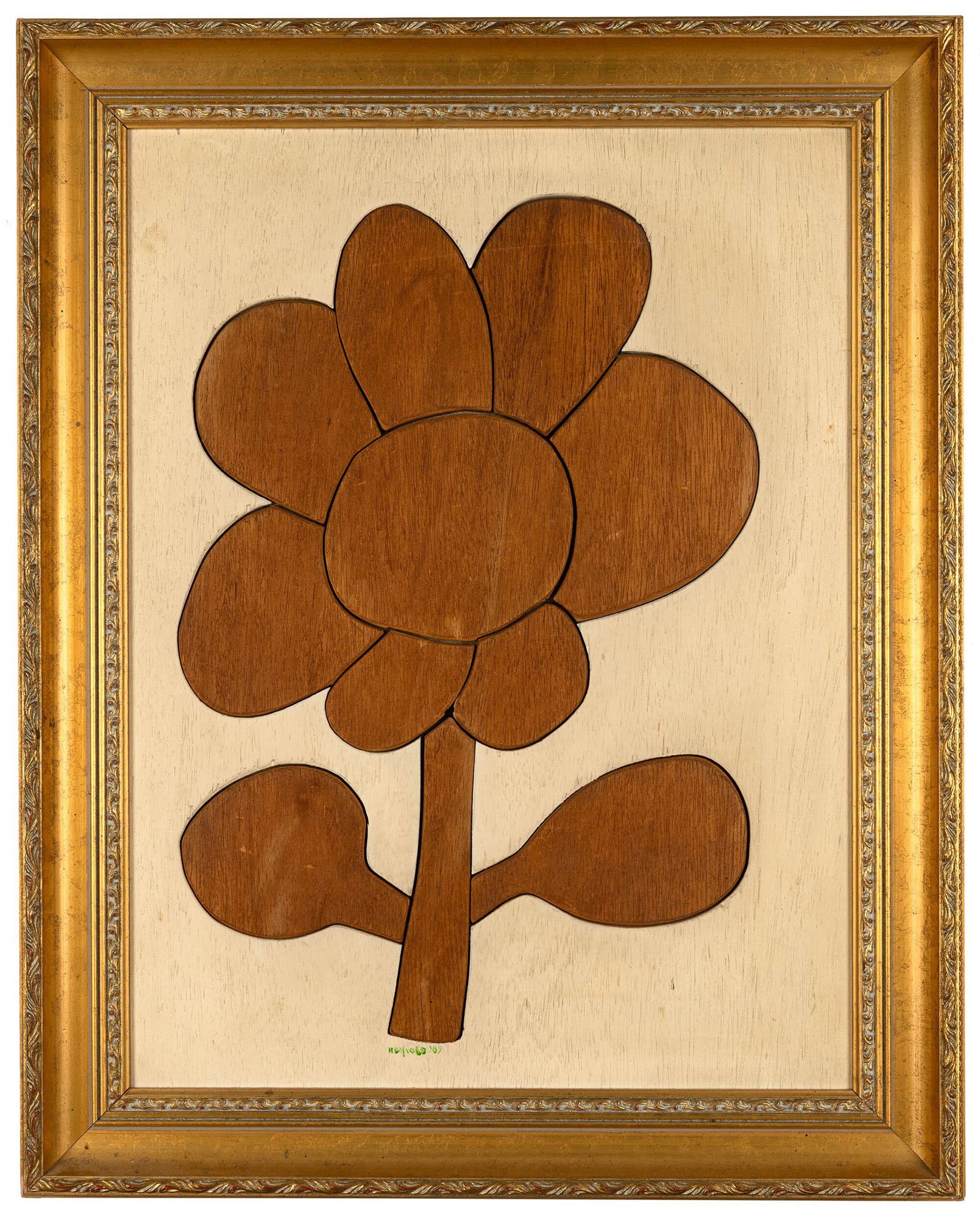 Lotto 107 | Ugo Nespolo Nascita: 1941 Mosso (BI) Margherita legno intarsiato Largh. 46 -...