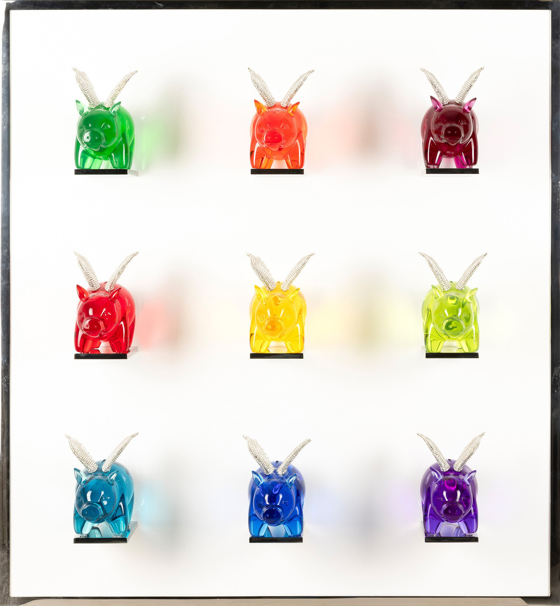 resina uretanica pigmentata, cristalli Swarovski e acciaio inossidabile lucidato su pannello acrilico