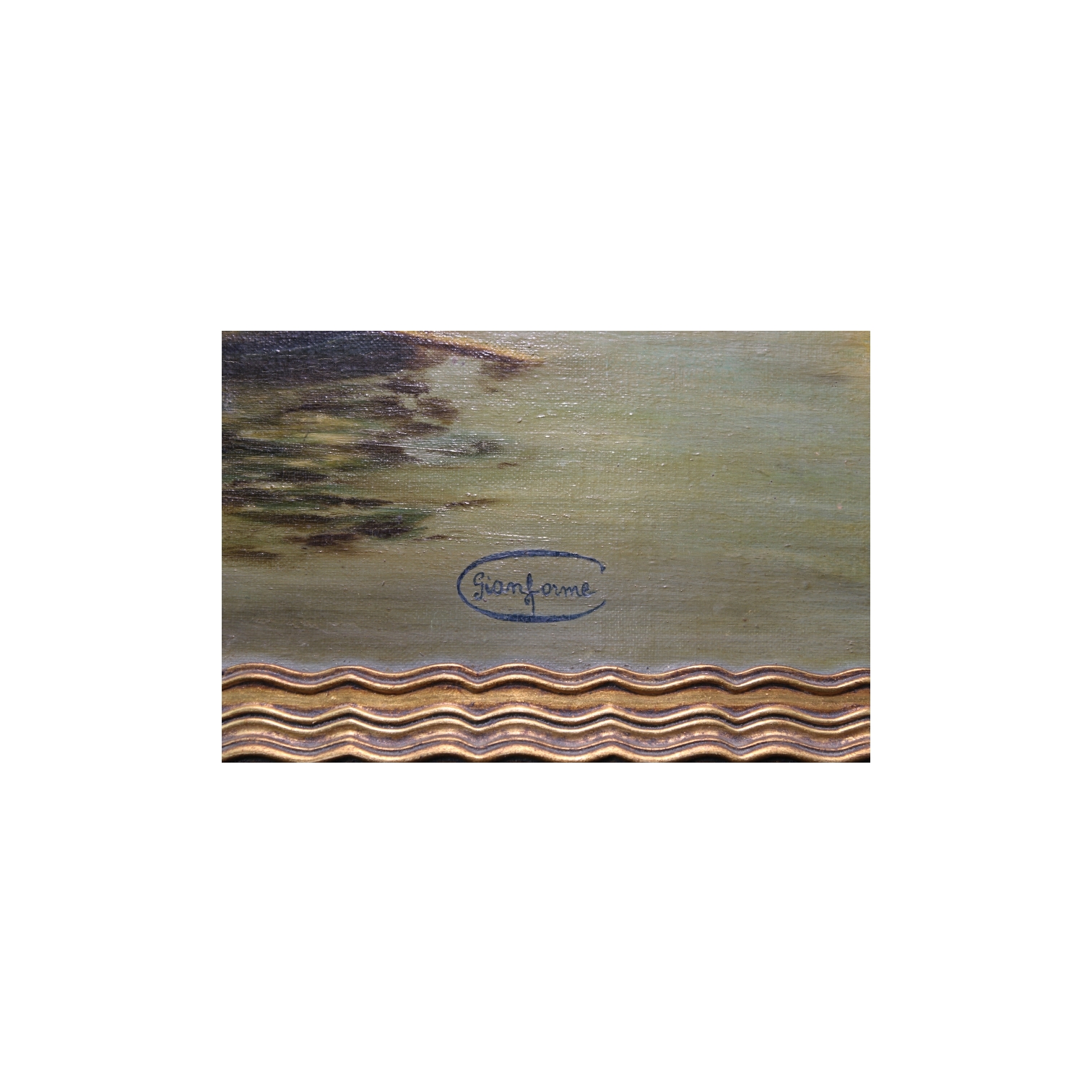 OLIO SU TELA RIPORTATO SU CARTONCINO raffigurante marina con barche e personaggi firmato Gianforena, dentro cornice in legno dorato XX secolo h cm 69 x 45 / cornice h cm 76 x 52