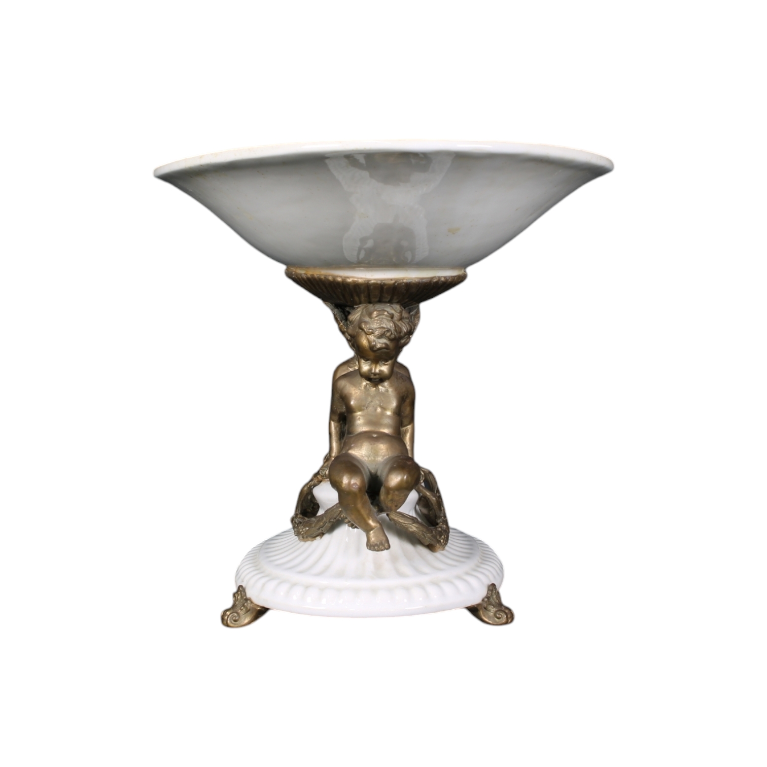 CENTROTAVOLA in porcellana bianca decorata da due putti alati in bronzo Francia XX secolo h cm 27 x 40 x 26,5