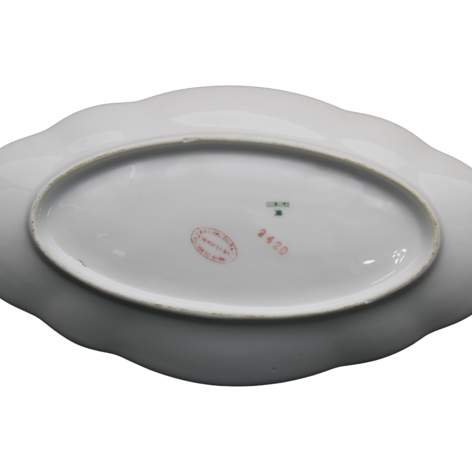 SERVIZIO DI 111 PEZZI in porcellana con lumeggiature dorate e applicazioni floreali Richard Ginori composto da 1 insalatiera, 12 piatti fondi, 34 piatti piani,22 piatti frutta, 12 piatti dolce,11 portauovo, 2 alzate, 2 zuppiere, 1 salsiera, 4 vassoi ovali, 1 mestolo e 2 piatti da portata XX secolo misure varie, difetti.