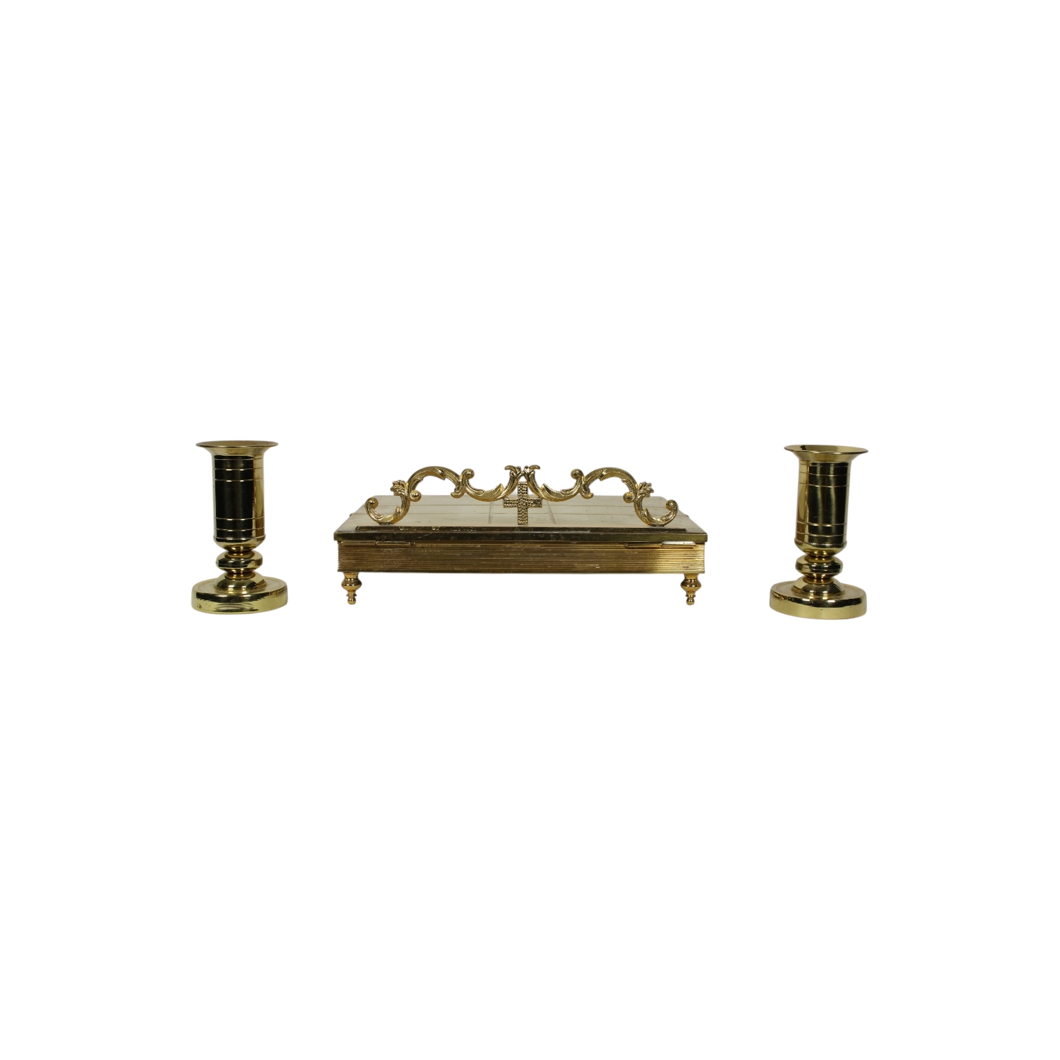 LOTTO COMPOSTO DA un leggio per messale e due porta candele monocera in metallo dorato Italia XX secolo h cm 18 x 34 x 25 / h cm 15 x Ø 8