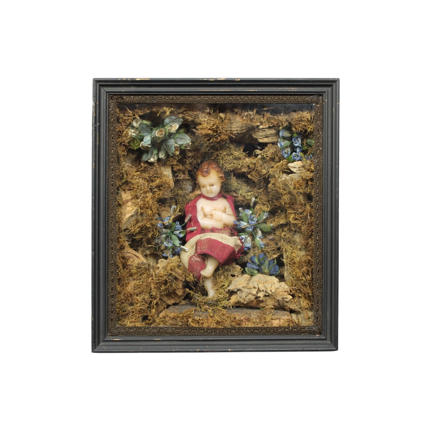 TECA in legno contenente piccolo bambinello in cera con decorazioni in sughero a formare grotta e decorazioni floreali in seta Sicilia fine 800 primi 900 h cm 27 x 24