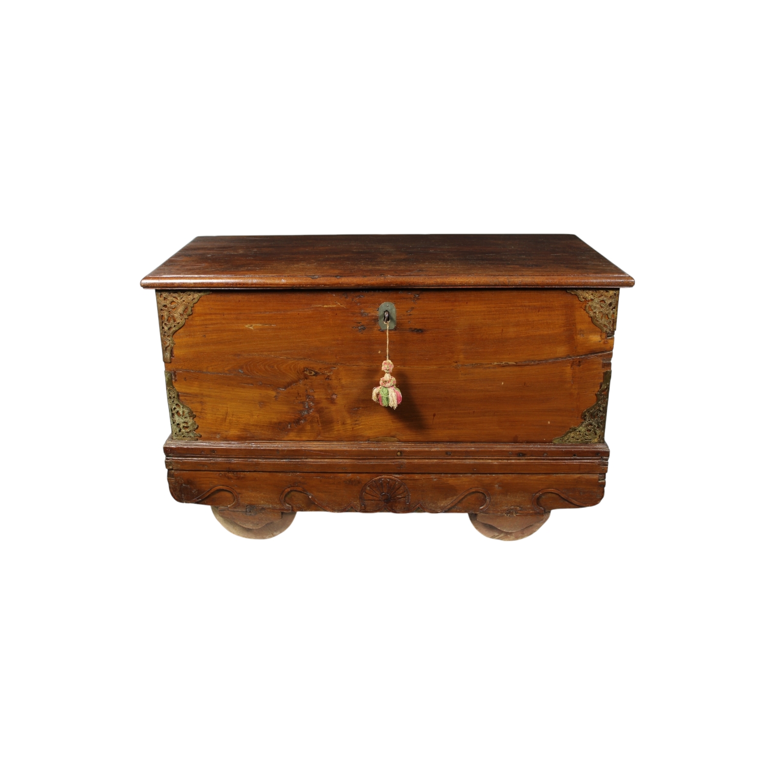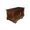 CASSAPANCA DA VIAGGIO in legno di noce con ruote in legno arricchita da applicazioni in metallo traforato maestranze venete XIX secolo h cm 73 x 113 x 52