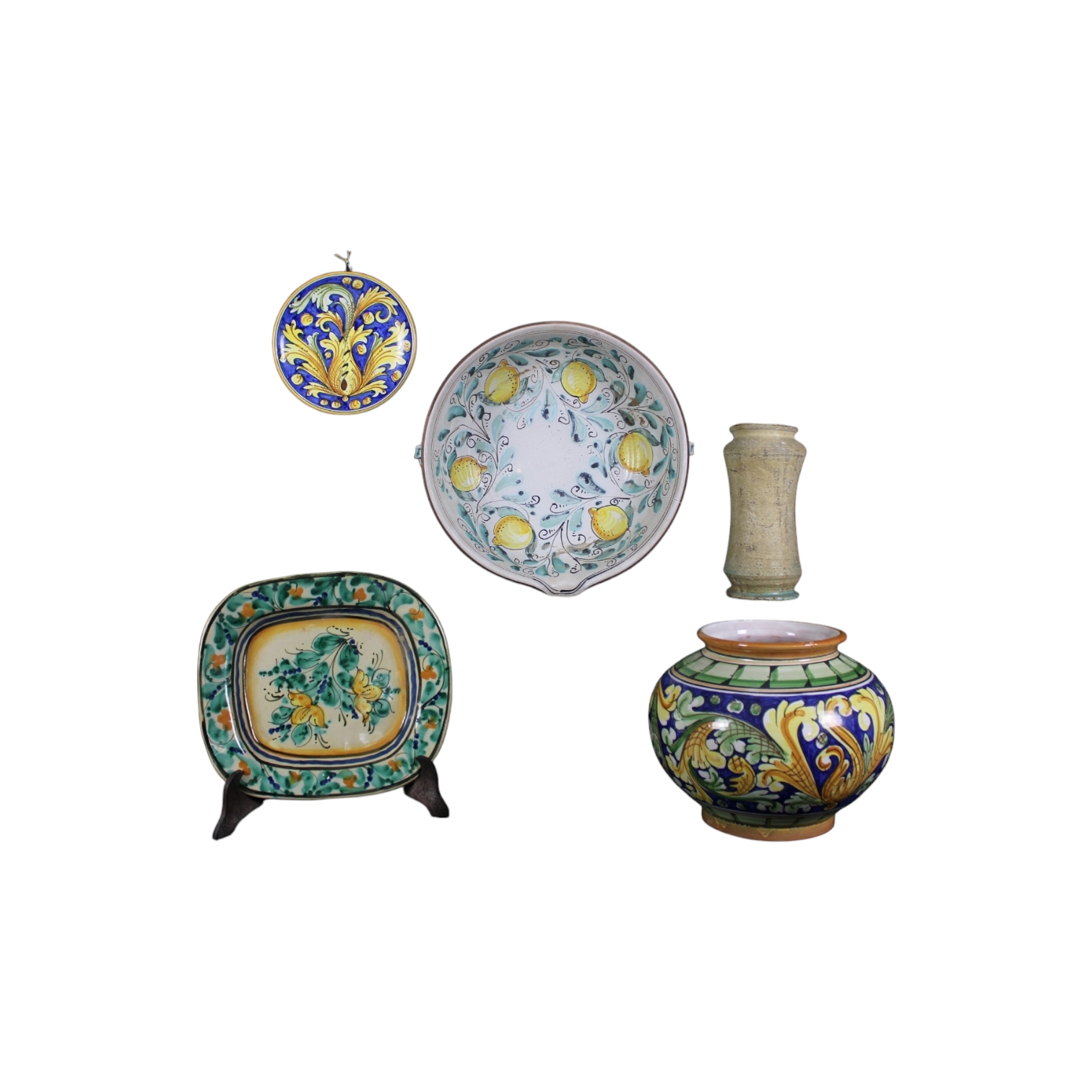 LOTTO COMPOSTO DA 5 oggetti in maiolica diversi usi, misure ed epoche misure varie