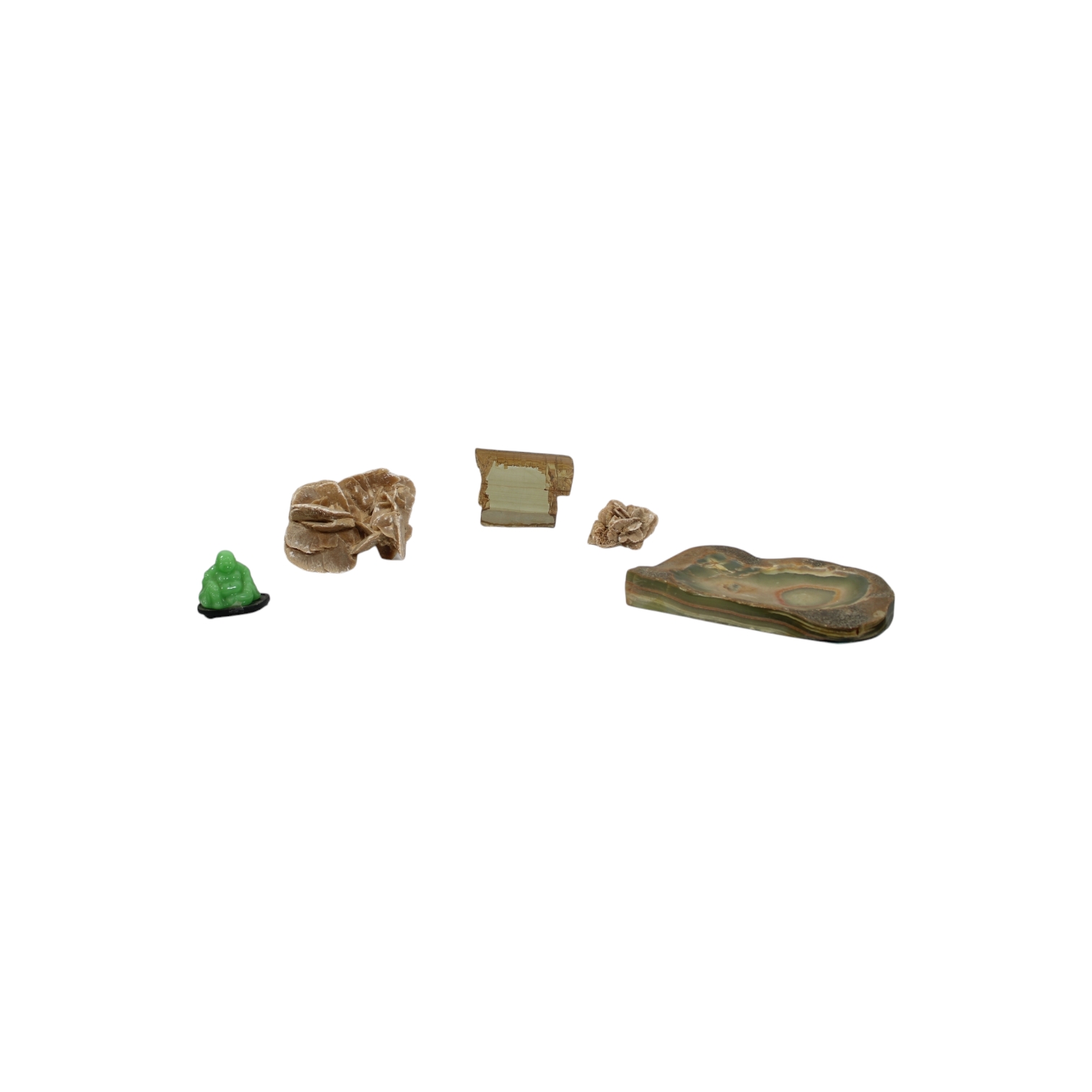LOTTO COMPOSTO DA 5 oggetti di cui, 2 rose del deserto, 1 frammento di pietra paesina con certificato di garanzia, 1 posacenere in pietra, 1 budda in giada di manifattura orientale misure varie