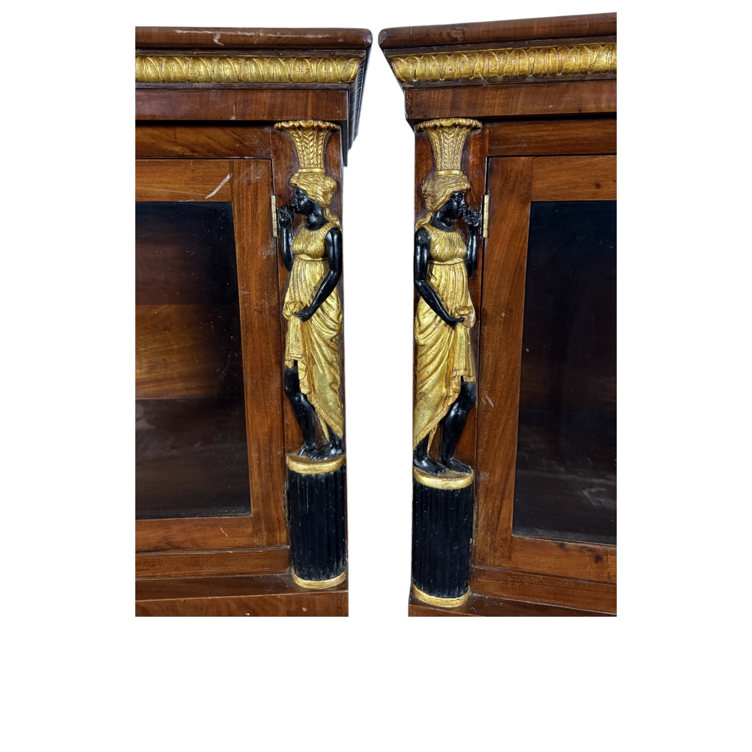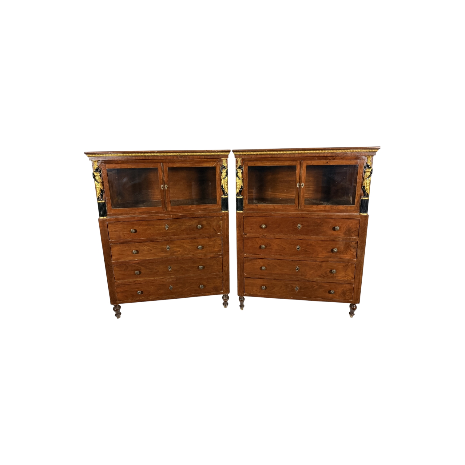 COPPIA CHIFFONIER IMPERO in legno di mogano con 2 ante a vetri nella parte superiore e quattro cassetti nella parte inferiore arricchite da erme in legno laccato e dipinto raffiguranti figure femminili masetranze siciliane 1810-1830 circa h cm 162 x 122 x 52